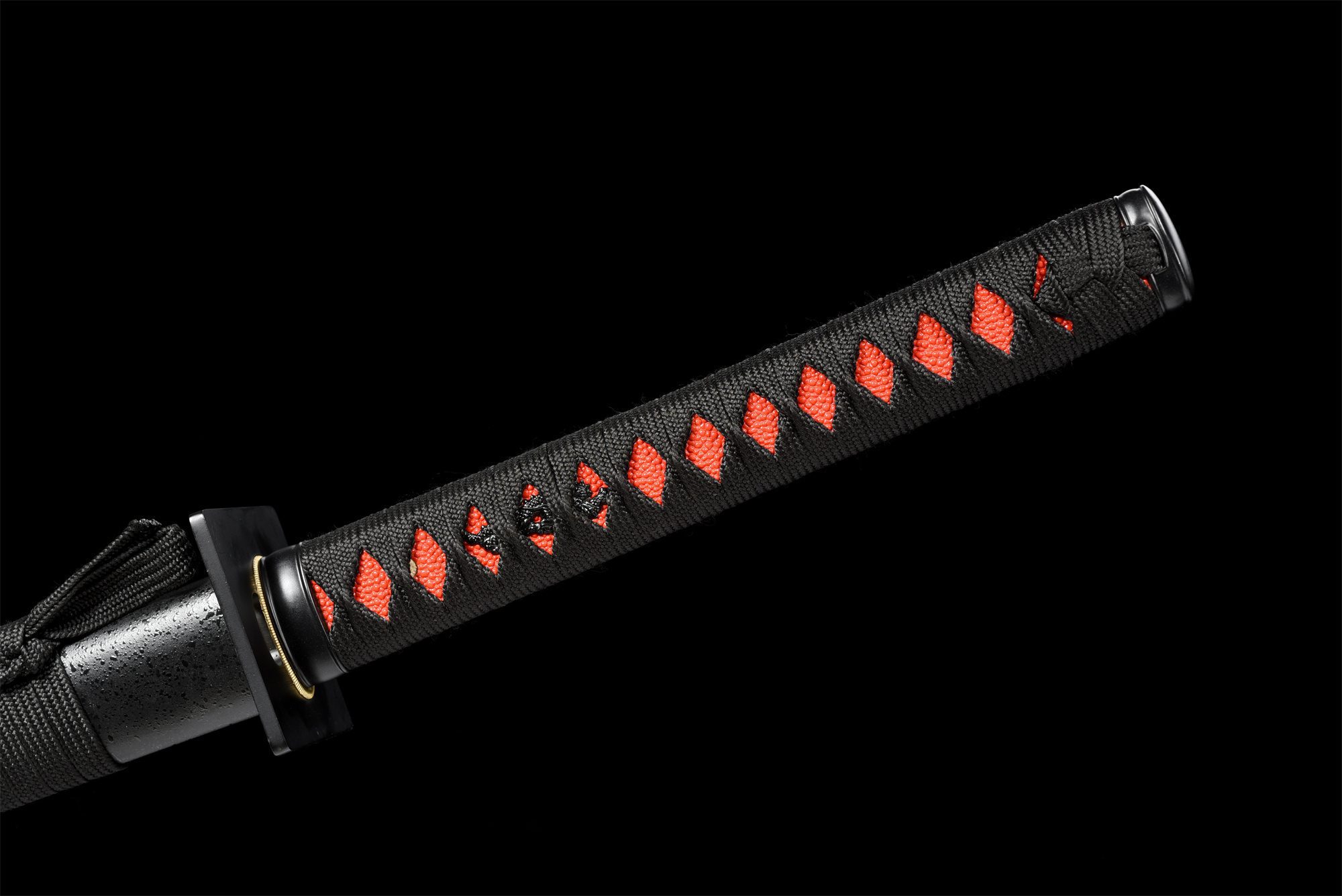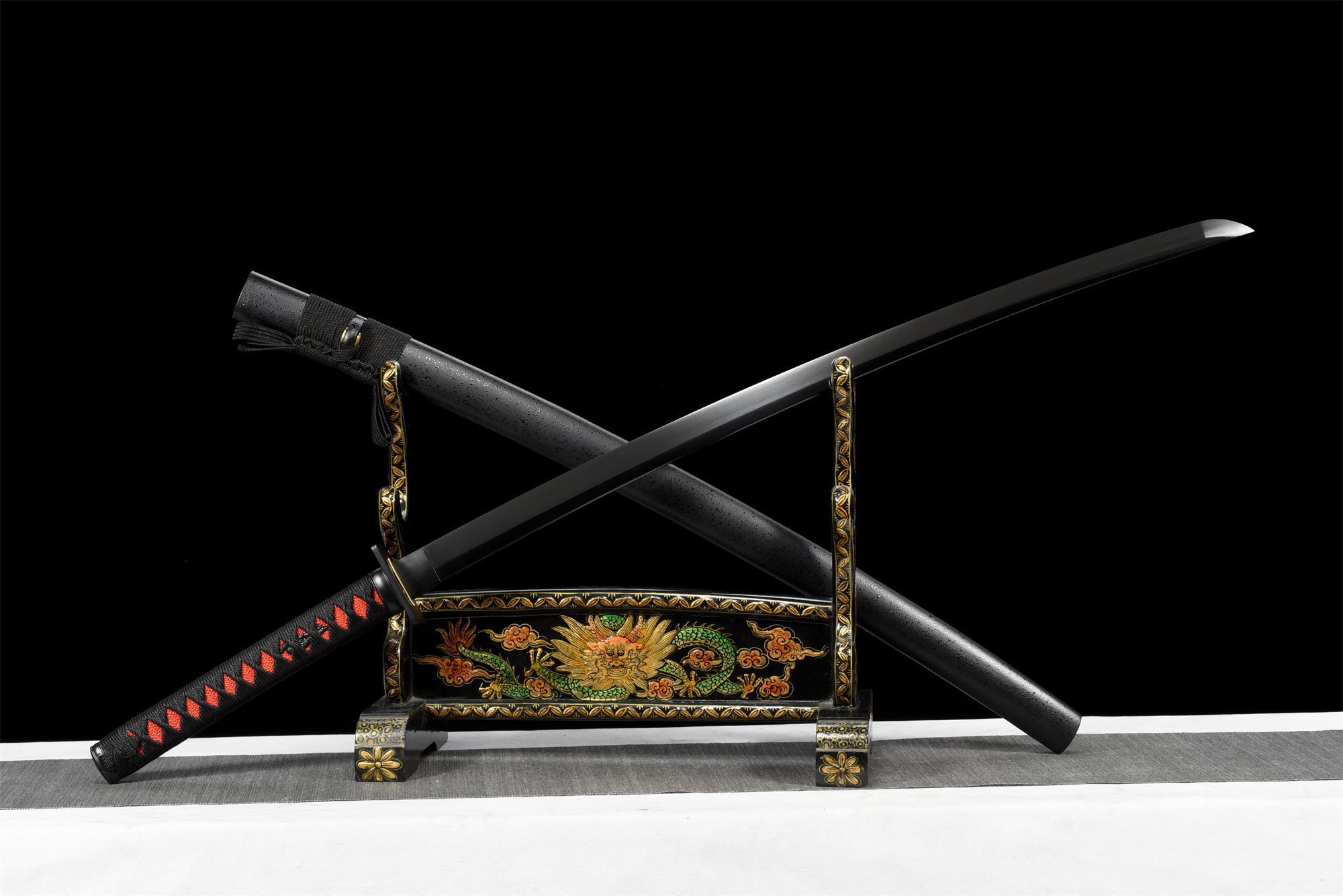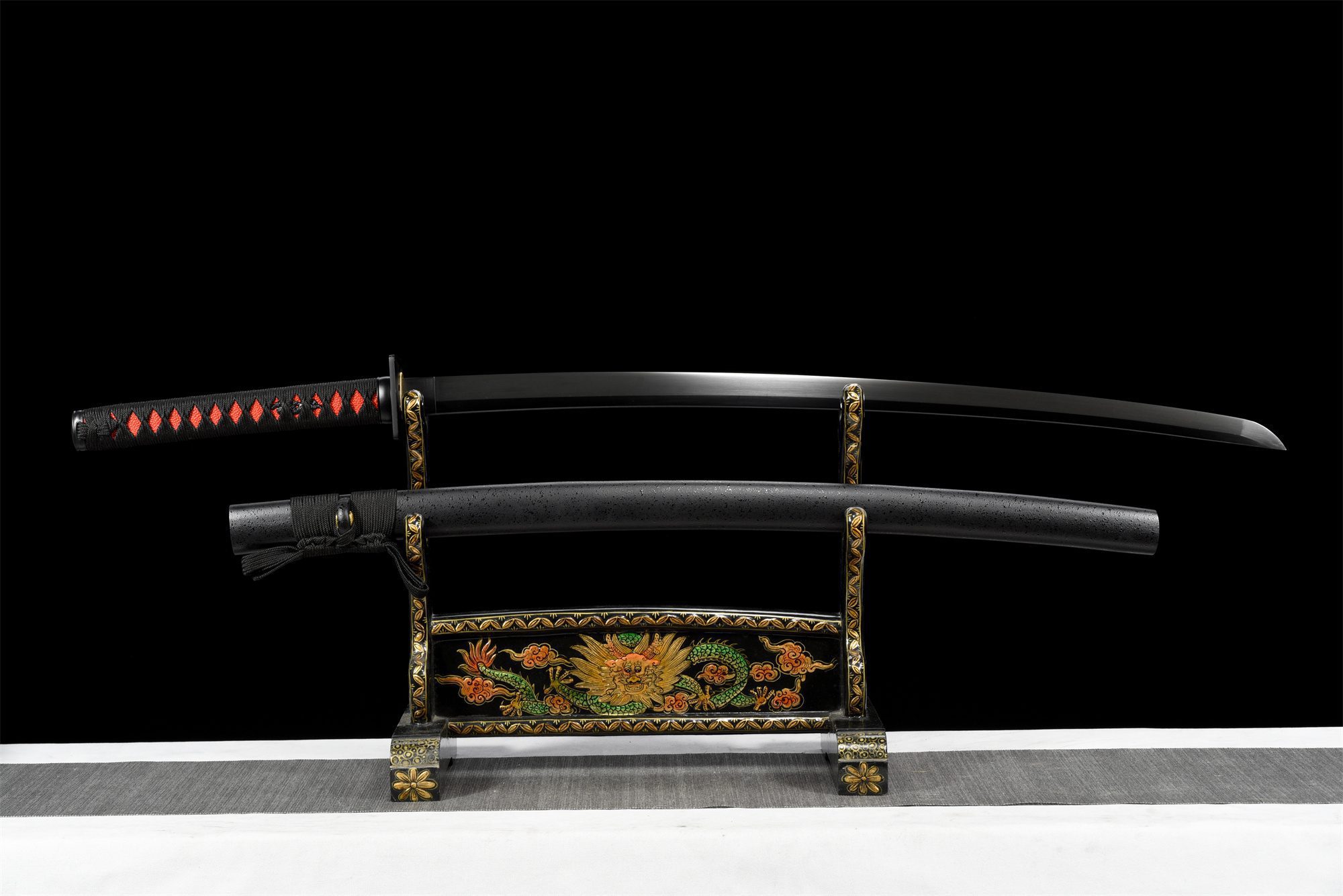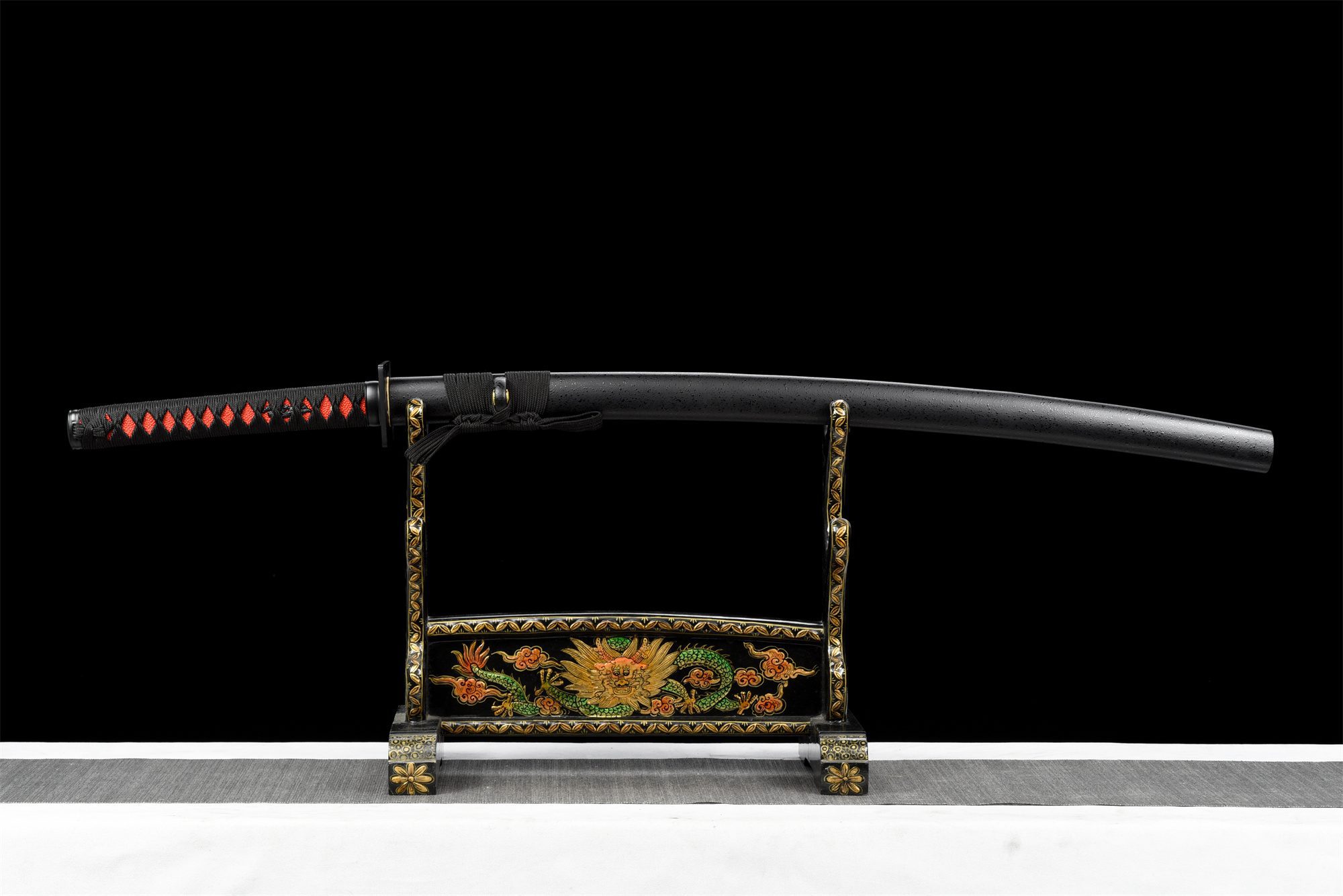 Czarne ostrze ze stali 1060 zapewnia wyjątkową wytrzymałość, zachowując jednocześnie elastyczność niezbędną do walki. Matowa powierzchnia pochłania światło i nadaje broni imponujący wygląd. Kwadratowa czarna osłona (tsuba) z stopu metali doskonale uzupełnia tę monochromatyczną estetykę, a jej geometryczne linie dodają subtelnego, nowoczesnego akcentu. Rękojeść (tsuka) harmonijnie łączy czerwoną skórę płaszczki i drewno, tworząc uderzający kontrast z czarnym oplotem w romby (tsuka-ito). Menuki przedstawiające czarne smoki wzmacniają mistyczny charakter całości, a fuchi i kashira z gładkiego czarnego stopu zachowują estetyczną spójność. Czarna lakierowana drewniana pochwa (saya) odzwierciedla tradycyjną japońską elegancję, uzupełnioną czarną sageo, która podkreśla ogólną prostotę dzieła.