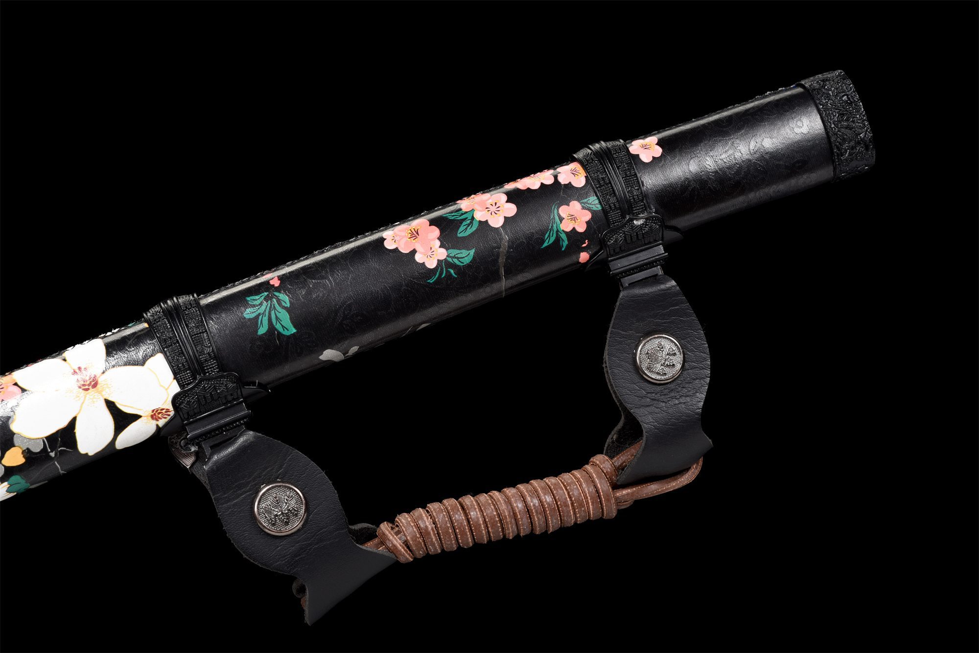 - Pochwą (Saya 鞘): czarne lakierowane drewno z motywami kwiatowymi, czarne końcówki.