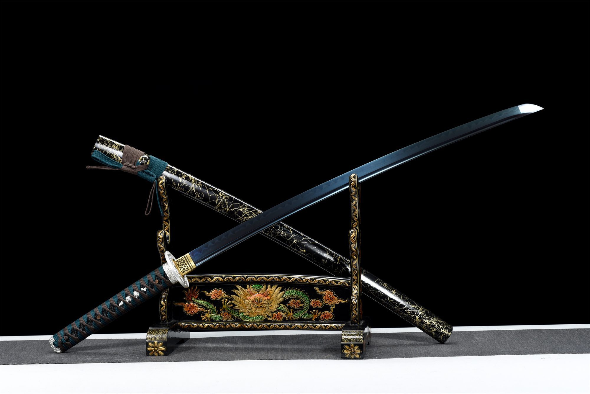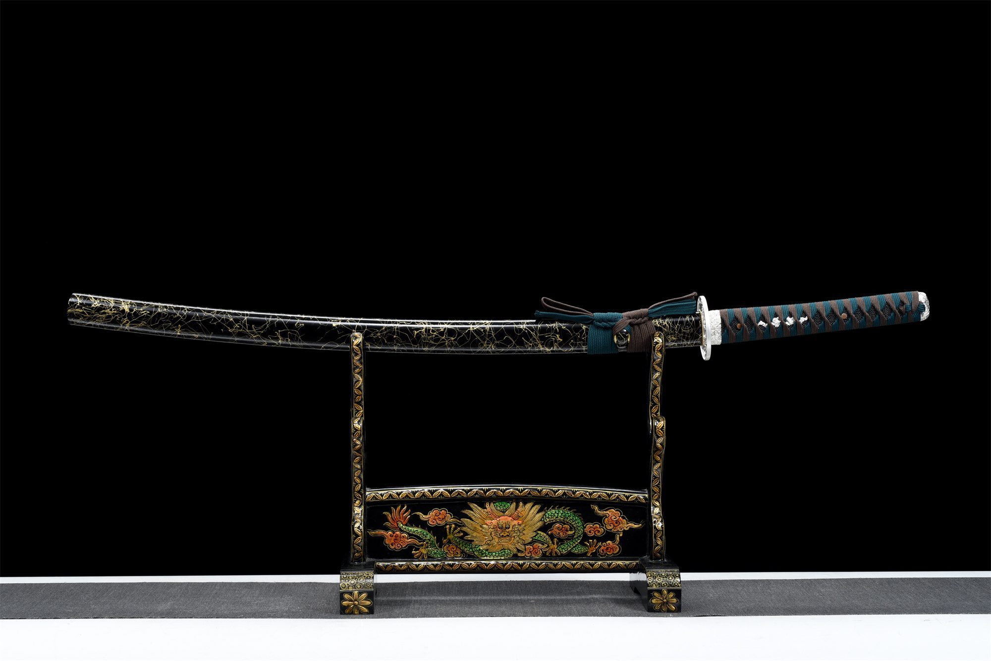 Ostrze ze stali T10 ma głęboki niebieski odcień, który odbija światło niczym tafla jeziora o zmierzchu, a tradycyjny wzór hamon tworzy charakterystyczne fale wzdłuż krawędzi tnącej. Zaokrąglona tsuba ze stopu srebra zdobiona jest precyzyjnie wyrzeźbionym smokiem, który wydaje się ożywać w zmieniającym się świetle i cieniach. Rękojeść ujawnia niezwykłe kunsztowność wykonania: czarna skóra płaszczki zapewnia pewny i wygodny uchwyt, pokryty brązowo-niebieskim oplotem tsuka-ito tworzącym idealne geometryczne romby. Menuki przedstawiają białe smoki, które elegancko kontrastują z ciemnymi tonami całości. Czarna, lakierowana pochwą z litego drewna jest ozdobiona delikatnymi żółtymi wzorami, tworząc uderzający kontrast, uzupełniony niebiesko-brązowym sageo, które harmonijnie nawiązuje do kolorów oplotu.