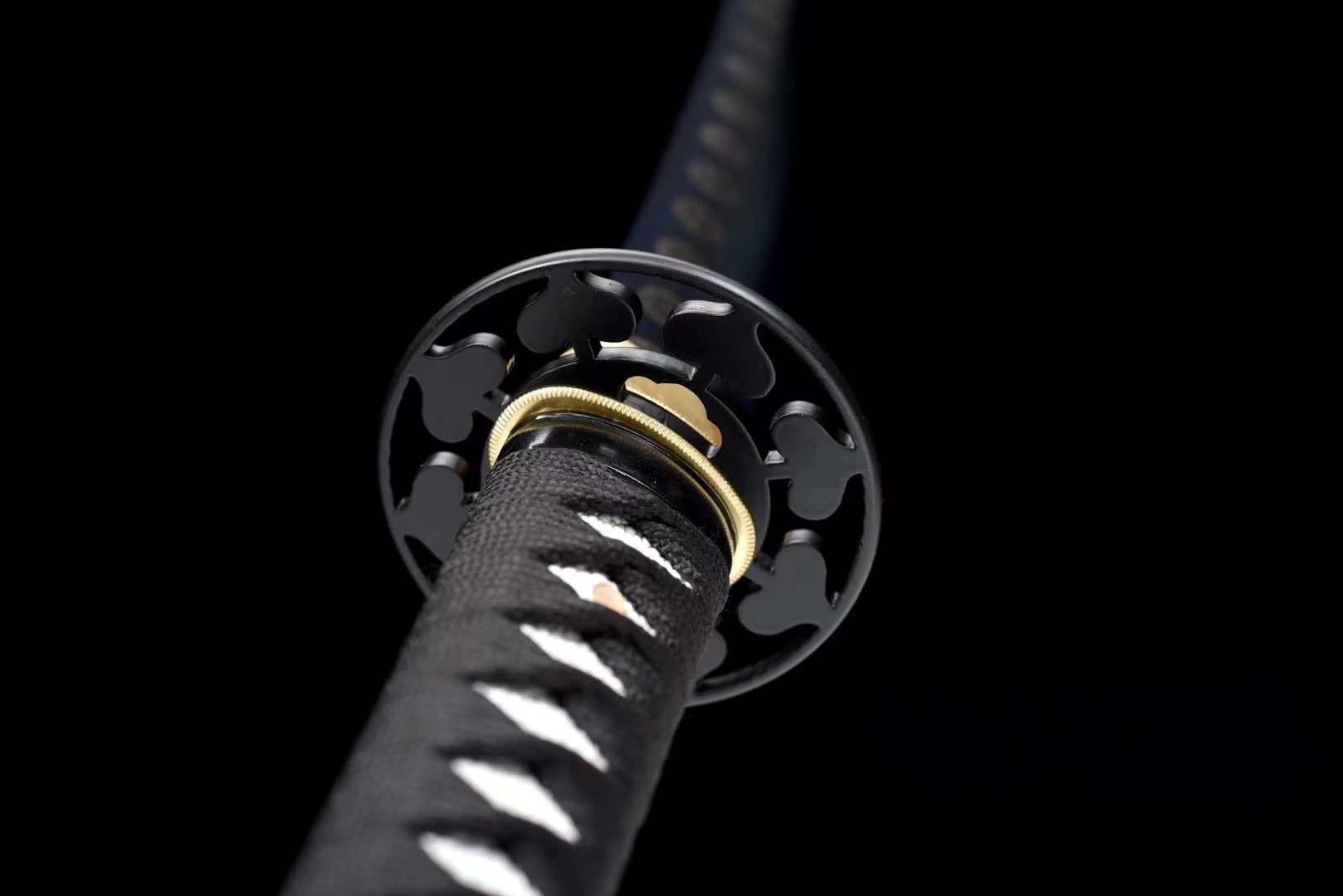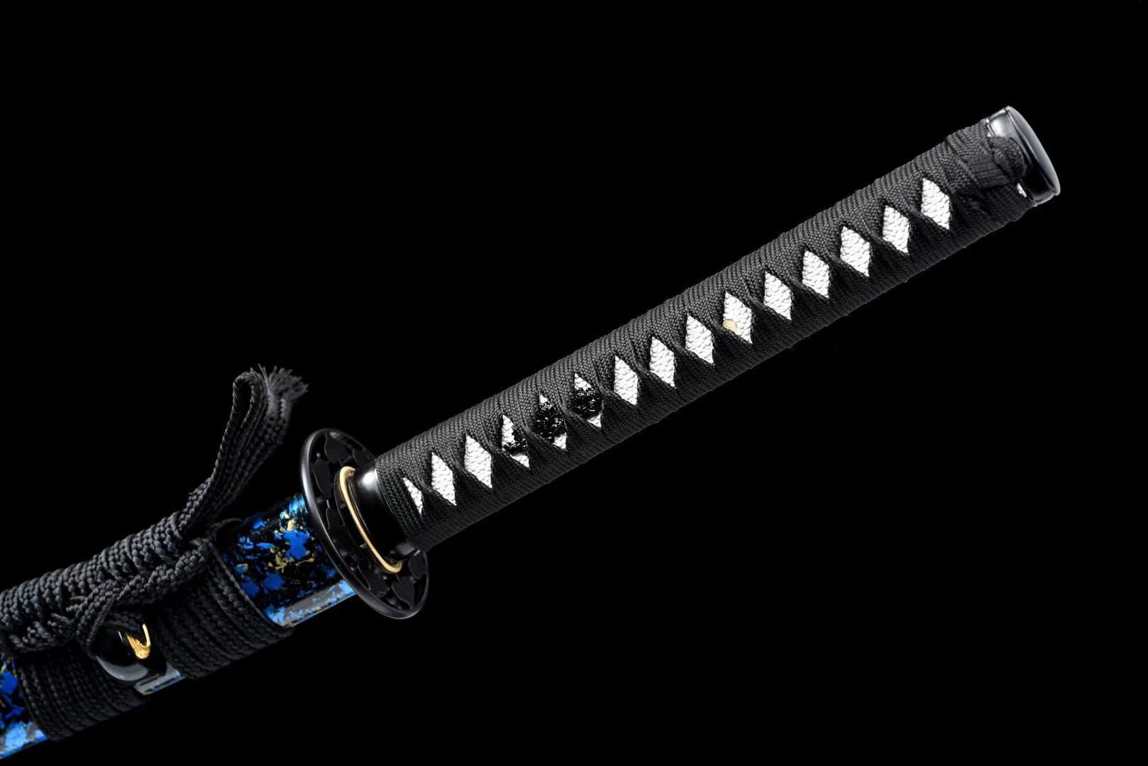 Jej ostrze ze stali T10 charakteryzuje się uderzającym niebieskim odcieniem, podkreślonym delikatnie wykonanym grawerowaniem białym kamonem, który kontrastuje z metalicznym połyskiem. Okrągła czarna osłona (tsuba) wykonana ze stopu metali zawiera precyzyjnie wyrzeźbione symbole w kształcie kolców, tworząc wyrafinowaną grę światła i cienia. Rękojeść (tsuka) harmonijnie łączy białą imitację skóry płaszczki i czarne plecionki (tsuka-ito) w rombowy wzór, a menuki przedstawiają czarnego smoka, symbol mocy i mądrości. Czarna lakierowana drewniana pochwa (saya) jest ozdobiona niebieskimi i żółtymi plamkami przywodzącymi na myśl niebiańskie chmury, uzupełniona czarnym sageo i dopasowanymi okuciami (kojiri, koiguchi).