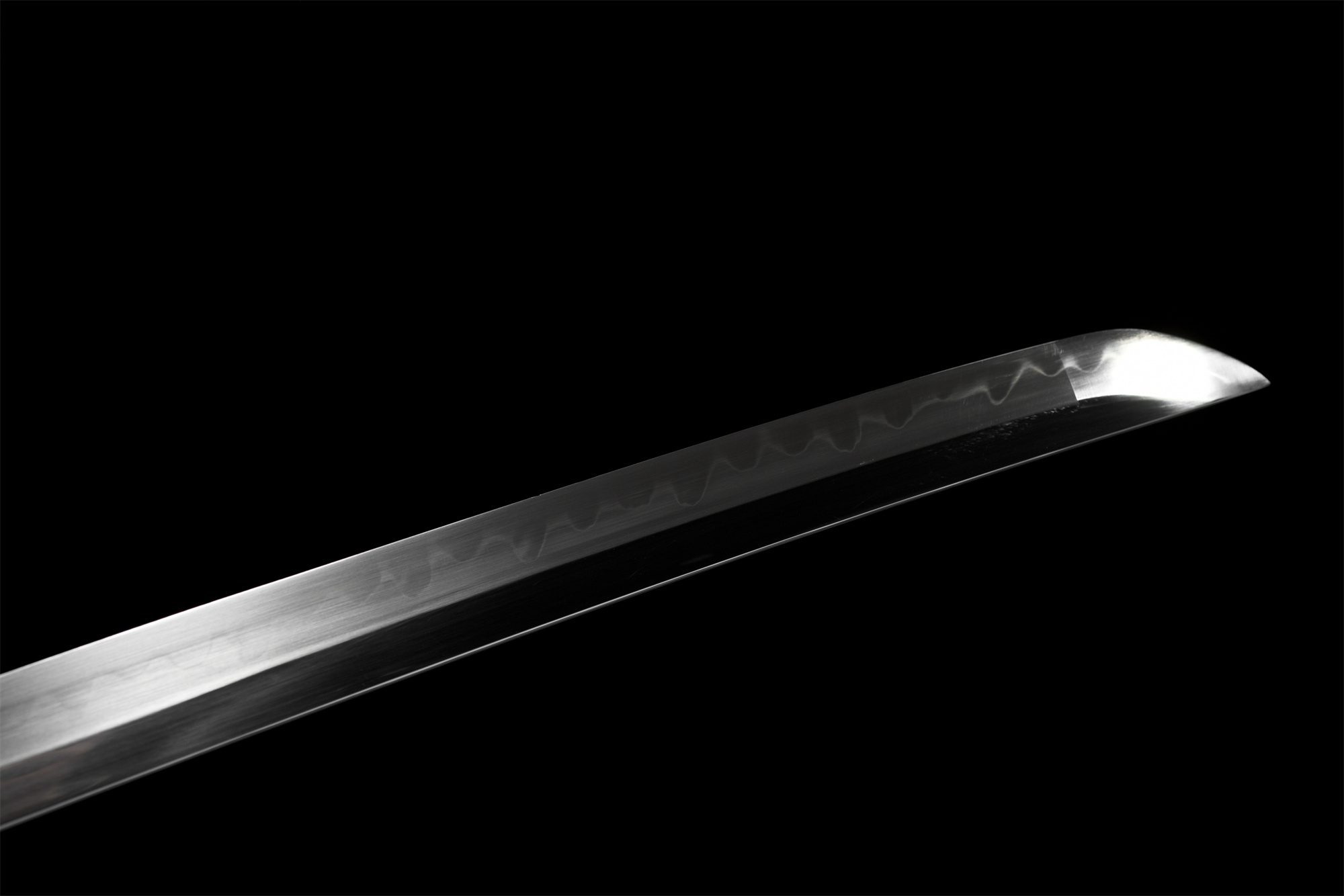 Ostrze ze stali T10 ujawnia autentyczny wzór midare hamon, będący wynikiem kontrolowanego hartowania różnicowego, które tworzy faliste linie na polerowanej stali. Ta starożytna technika nadaje ostrzu wyjątkowe właściwości, jednocześnie tworząc efektowny efekt wizualny. Zaokrąglona złota mosiężna tsuba przedstawia motywy fal i wiatru, symbole płynności i nieustannego ruchu. Rękojeść harmonijnie łączy autentyczną skórę płaszczki i twarde drewno, a ciemnobrązowe plecionki w romby zapewniają pewny i elegancki uchwyt. Menuki przedstawiają czarne smoki, mitycznych strażników mądrości i siły. Solidna, lakierowana drewniana pochwa chroni ostrze, a jej koiguchi wykonane z prawdziwego rogu odzwierciedla dbałość o szczegóły w rzemiośle.
