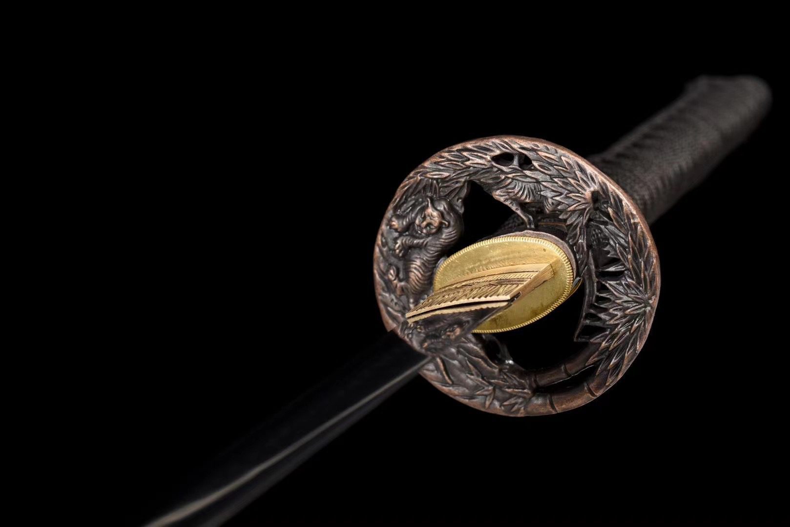 - Jelec (Tsuba 鍔): bogato rzeźbiona okrągła osłona z miedzi przedstawiająca tygrysy wśród bujnej roślinności.
