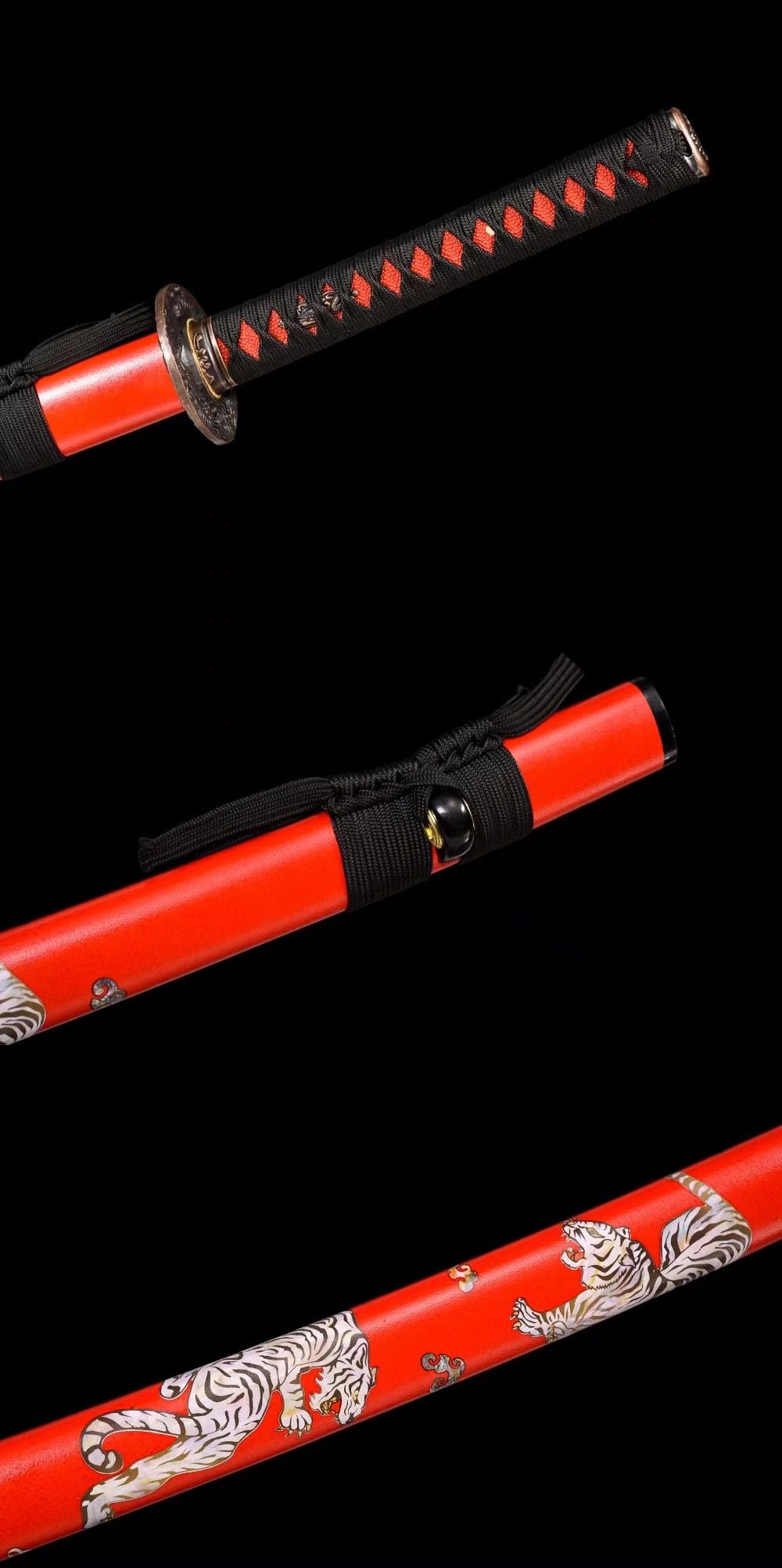 - Pochwą (Saya 鞘): czerwone lakierowane drewno z namalowanymi białymi tygrysami, czarne kojiri i koiguchi.