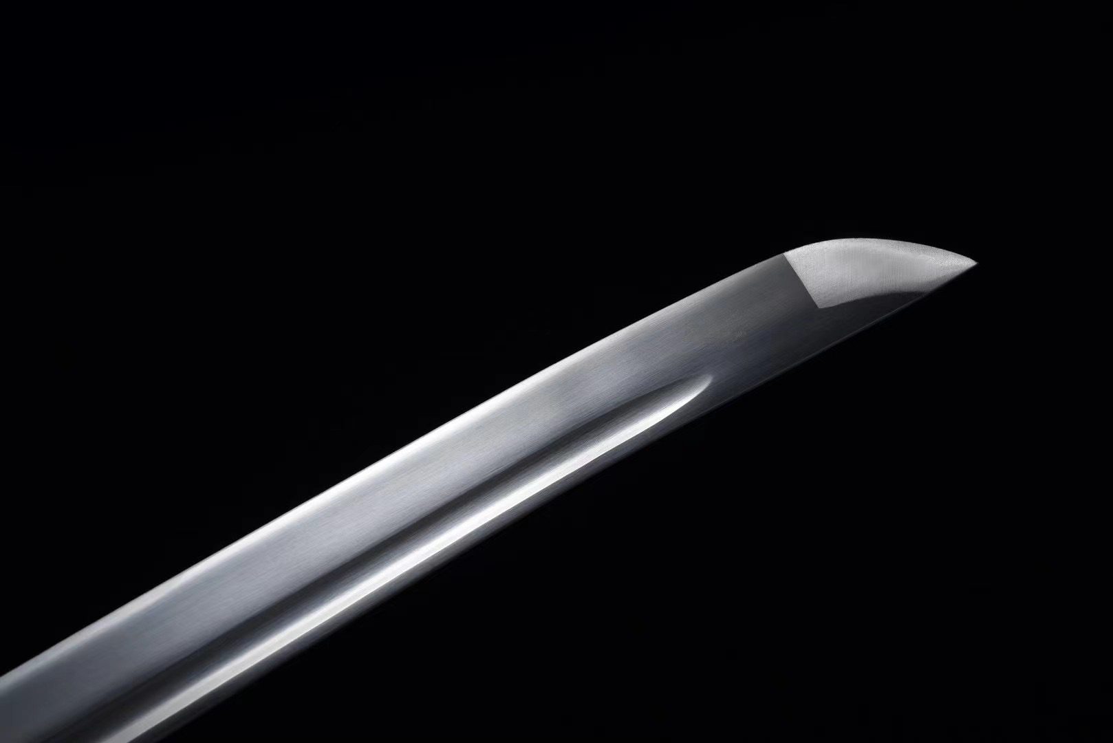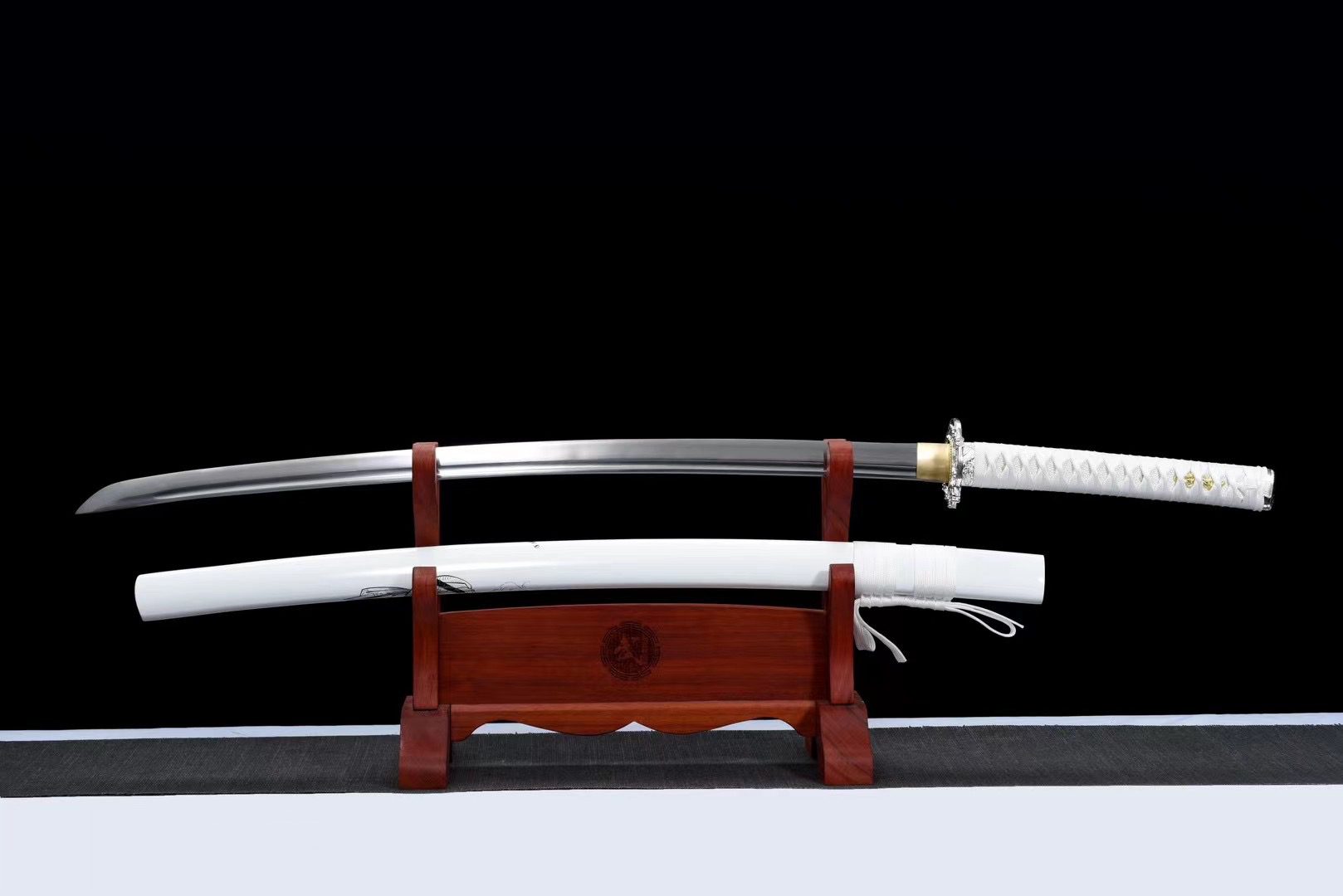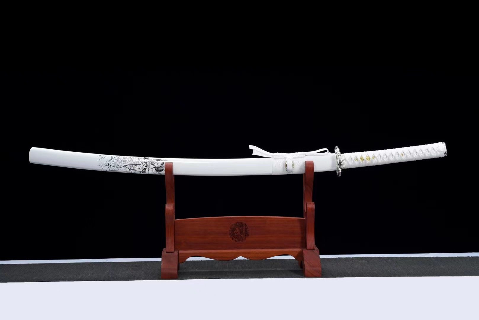 Ostrze ze stali T10 w naturalnym kolorze ma polerowane wykończenie, które ujawnia subtelne niuanse metalu, a bo-hi wyrzeźbia elegancki rowek, który rozjaśnia ogólny wygląd i wydaje charakterystyczny świst podczas ruchu. Okrągła, posrebrzana tsuba ze stopu metali zawiera precyzyjnie wyrzeźbione motywy chryzantem, symbolizujące długowieczność i szlachetność w japońskiej tradycji. Rękojeść harmonijnie łączy białą skórę płaszczki samegawa i drewno, owinięte białym splotem tsuka-ito z rombowymi wzorami, które zapewniają pewny i estetyczny uchwyt. Menuki przedstawiają złotego smoka, mitycznego strażnika mądrości i siły, natomiast fuchi i kashira ze stopu srebra są ozdobione delikatnymi grawerowaniami kwiatowymi. Biała lakierowana pochwa stanowi wyjątkowe tło dla malowideł przedstawiających szlachetne Japonki w tradycyjnych strojach, tworząc zestaw o rzadkiej wizualnej finezji.