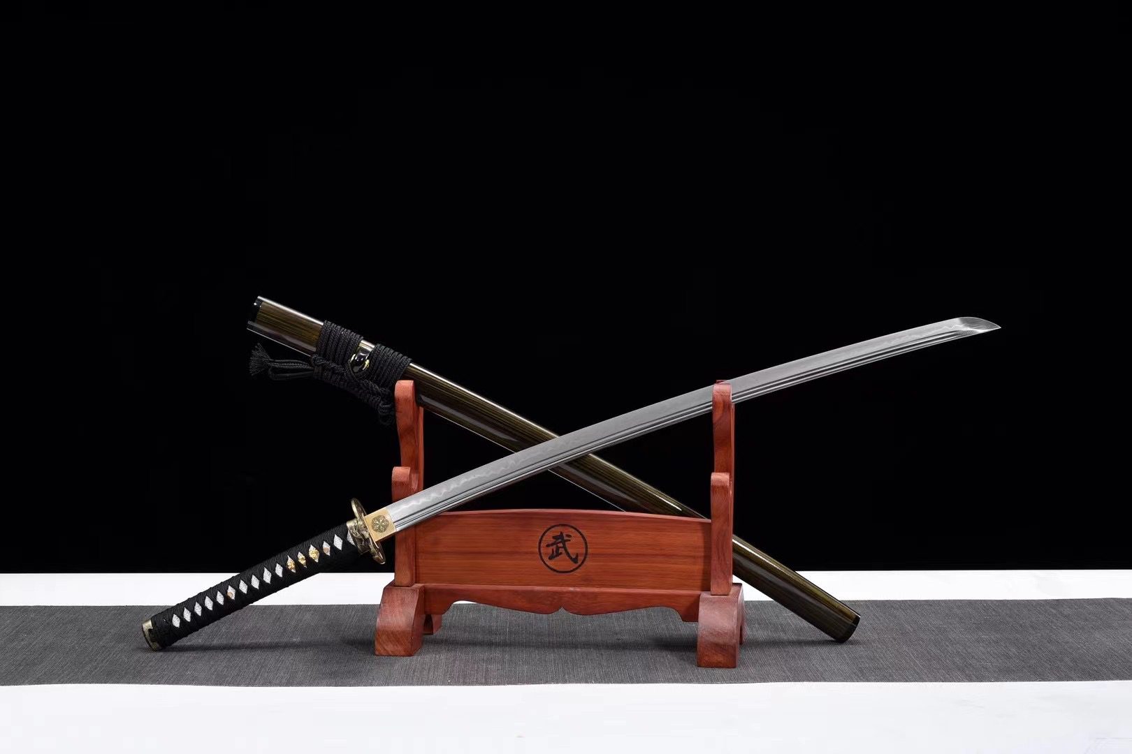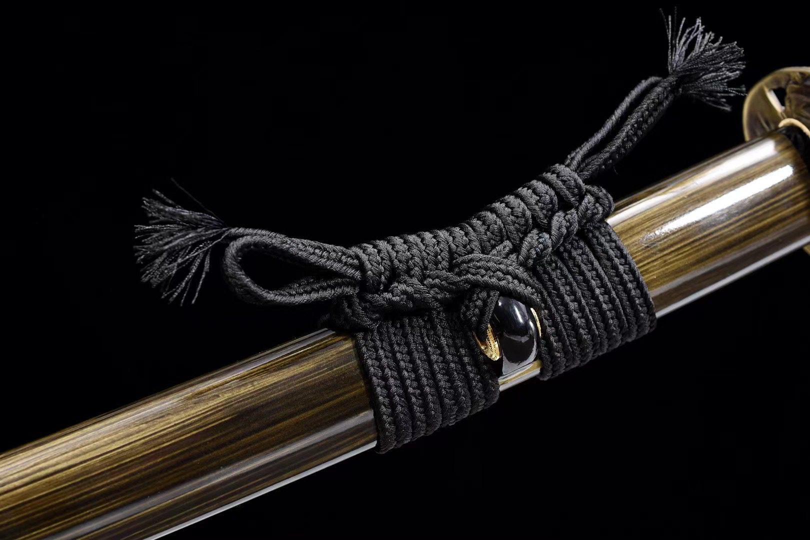 - Pochwą (Saya 鞘): przezroczyste, lakierowane drewno odsłaniające naturalne słoje, z czarnym Kojiri i Koiguchi.