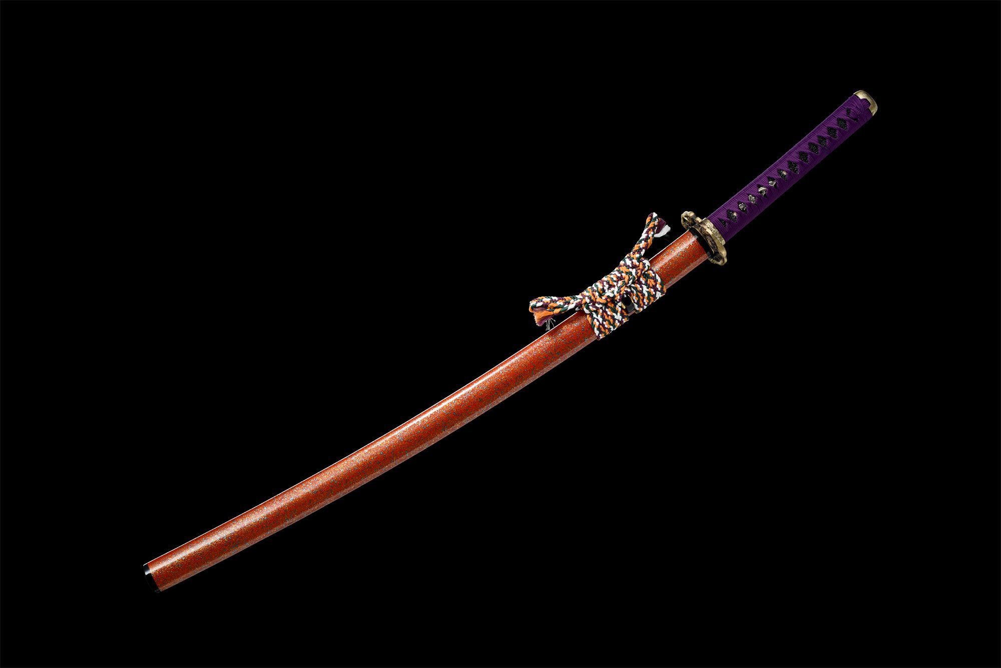 Jego ostrze ze stali T10 ujawnia autentyczny wzór midare hamon z tańczącymi płomieniami, stworzony dzięki różnicowemu hartowaniu, które nadaje stali wyjątkowe właściwości tnące i odporność. Zaokrąglona mosiężna tsuba przedstawia precyzyjnie wyrzeźbionego smoka, symbol wschodniej mocy i mądrości, podczas gdy pasujące fuchi i kashira mają grawerowania przywodzące na myśl fale i wiatr, elementy natury reprezentujące nieustanny ruch i niewidzialną siłę. Rękojeść łączy w sobie autentyczną skórę płaszczki (samegawa) i lite drewno, owinięte fioletowym oplotem (tsuka-ito), który elegancko kontrastuje ze złotymi menuki przedstawiającymi smoki. Pomarańczowa pochwa z żółtymi i niebieskimi ziarnistymi akcentami tworzy odważną kolorystykę, uzupełnioną wielobarwnym pomarańczowym, zielonym, fioletowym i białym sageo, które dodaje całości odrobinę wyrafinowania.