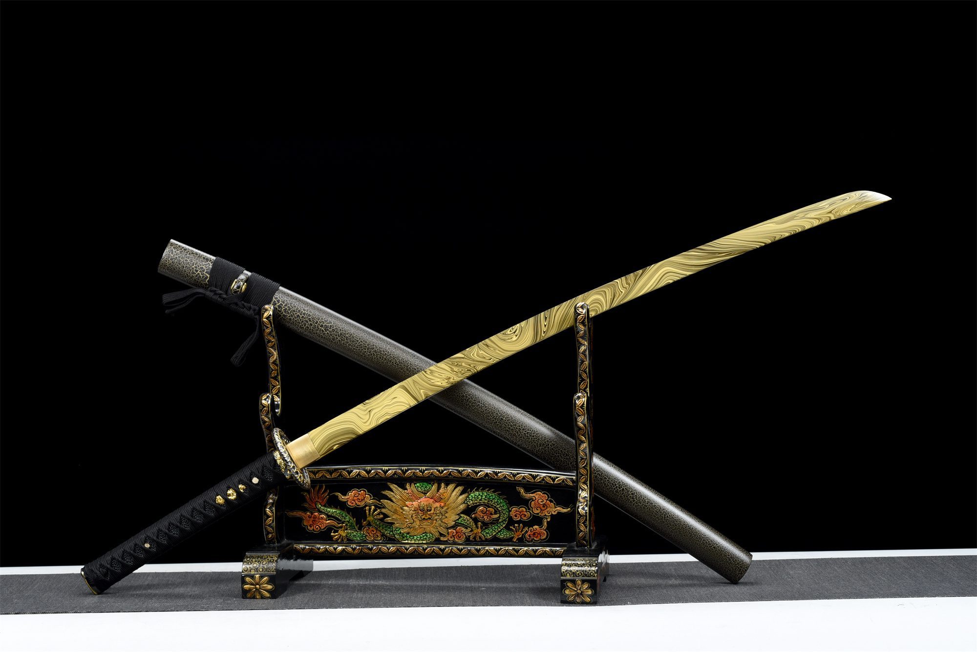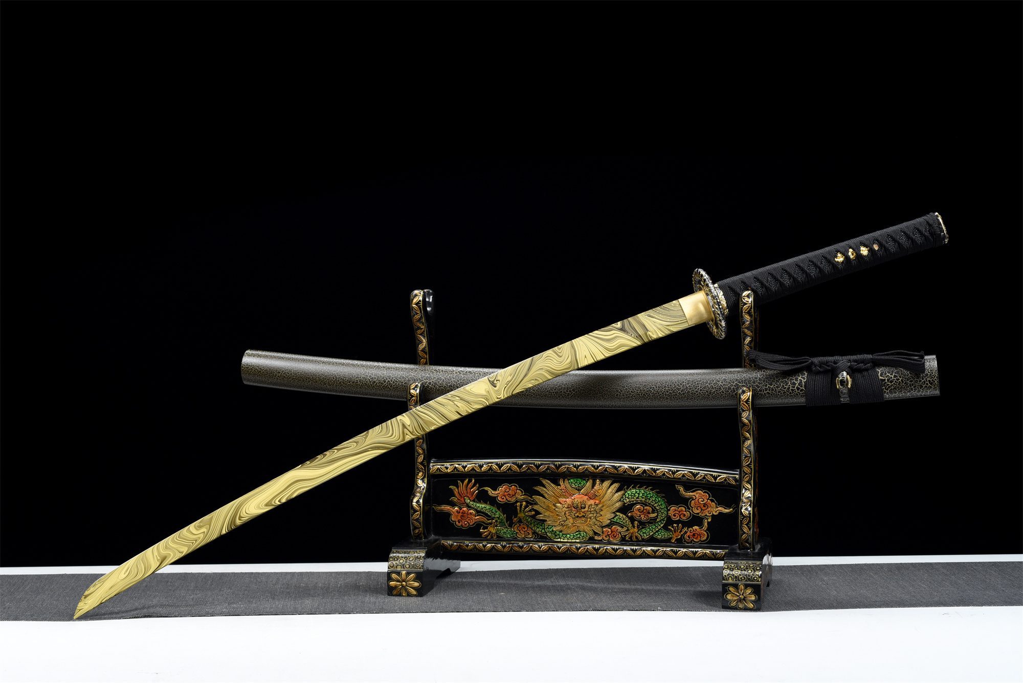 Ostrze ze stali manganowej charakteryzuje się charakterystycznym żółtym wzorem, który faluje na całej długości, tworząc złote refleksy tańczące w świetle. To wyjątkowe zabarwienie jest wynikiem specjalnej obróbki, która nadaje stali ciepłe odcienie, zachowując jednocześnie jej wytrzymałość. Zaokrąglona osłona (tsuba) harmonijnie łączy głęboką czerń i złote akcenty, tworząc uderzający kontrast z precyzyjnie wykonanym stopem miedzi. Rękojeść (tsuka) łączy w sobie lite drewno z czarną skórą płaszczki (samegawa), przeplataną czarnym oplotem (tsuka-ito) z wzorem rombów. Złote menuki przedstawiają smoka, symbolizującego siłę i mądrość, natomiast złote fuchi i kashira zdobią delikatne grawerowanie kwiatowe. Pochwa z litego drewna (saya) jest pomalowana i zdobiona grawerowanym motywem pantery, przywodzącym na myśl kocią siłę i zwinność drapieżnika.