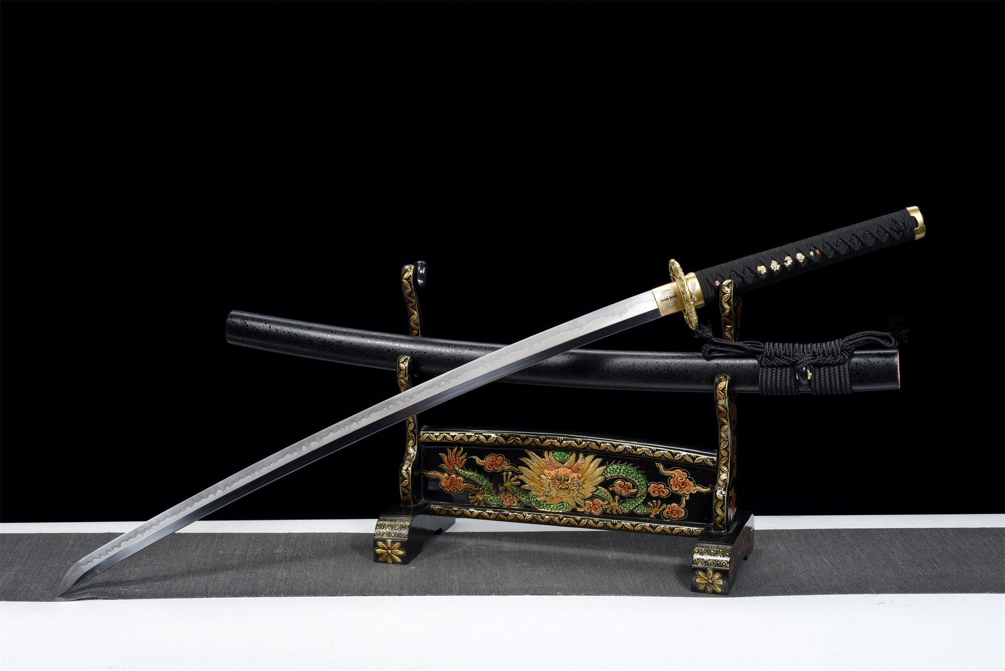 Jego ostrze ze stali T10 ma głębokie czarne wykończenie, które pięknie kontrastuje z widocznym hamonem, tworząc efektowną grę światła i cienia. Zaokrąglona, pozłacana miedziana tsuba ma precyzyjnie wyrzeźbionego smoka owiniętego wokół gardy, symbol wschodniej mocy i mądrości. Rękojeść harmonijnie łączy w sobie lite drewno i czarną sztuczną skórę płaszczki, a czarne tsuka-ito tworzy geometryczne wzory rombów, które zapewniają pewny i elegancki chwyt. Menuki przedstawiają złote smoki, które idealnie harmonizują z fuchi i kashira, również w kolorze złotym, tworząc niezwykłą estetyczną całość. Czarna, lakierowana pochwa z litego drewna dopełnia tę wyrafinowaną całość, ozdobiona czarnym sageo, które podkreśla ogólną powagę broni.