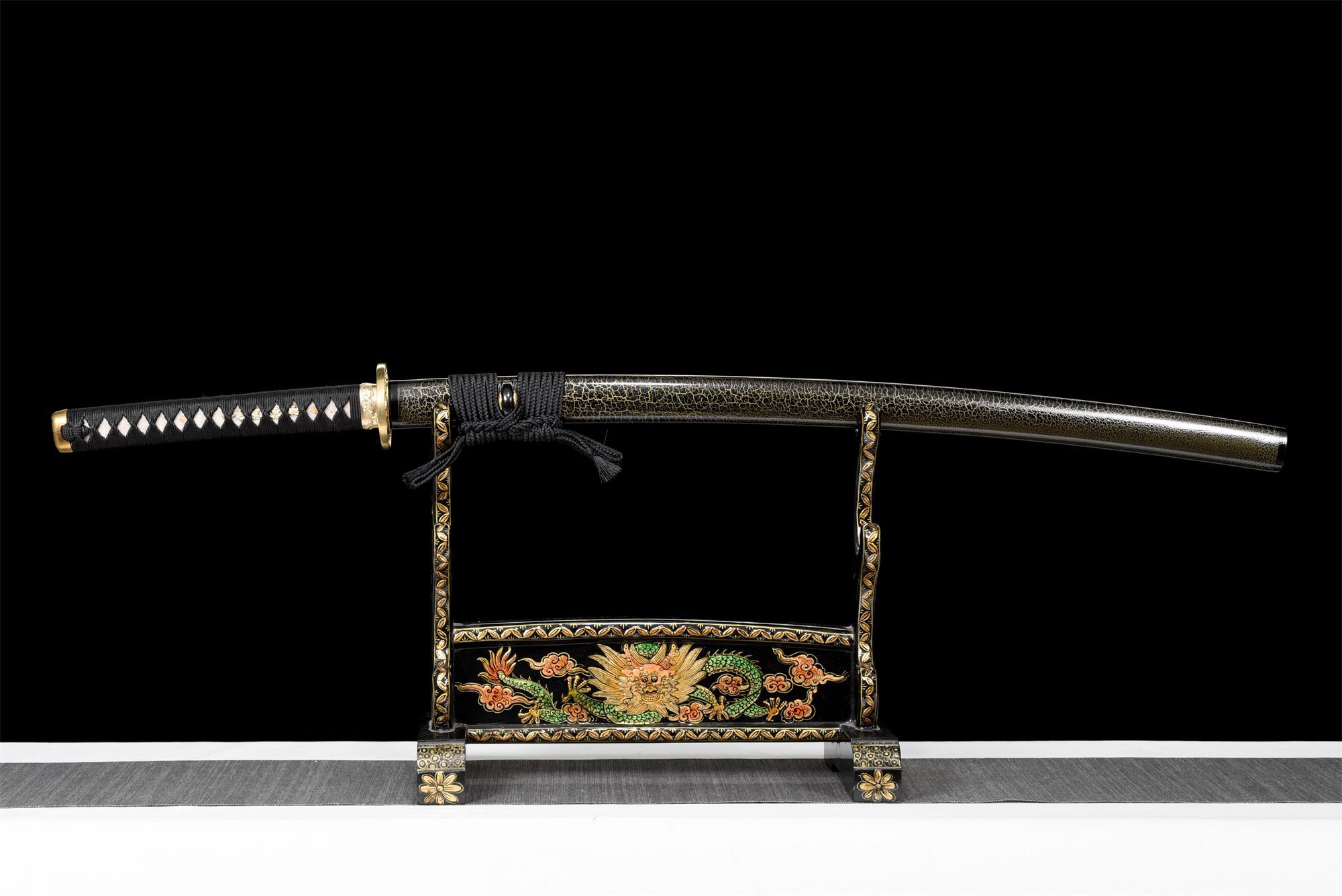 Ostrze ze stali T10 ujawnia autentyczny Suguba hamon, prostą linię hartowania, która świadczy o tradycyjnym japońskim rzemiośle. Ponadto zaokrąglona mosiężna tsuba ma wzór koronki przywodzący na myśl fale oceanu, tworząc poetycki kontrast z ziemską symboliką kota. Rękojeść łączy autentyczną skórę płaszczki z czarnym splotem w kształcie rombów, a złote menuki przedstawiają smoki, które dopełniają mistyczną ikonografię. Wreszcie, czarna lakierowana pochwa jest ozdobiona złotym motywem kota, a prawdziwy róg koiguchi dodaje jej tradycyjnej autentyczności.