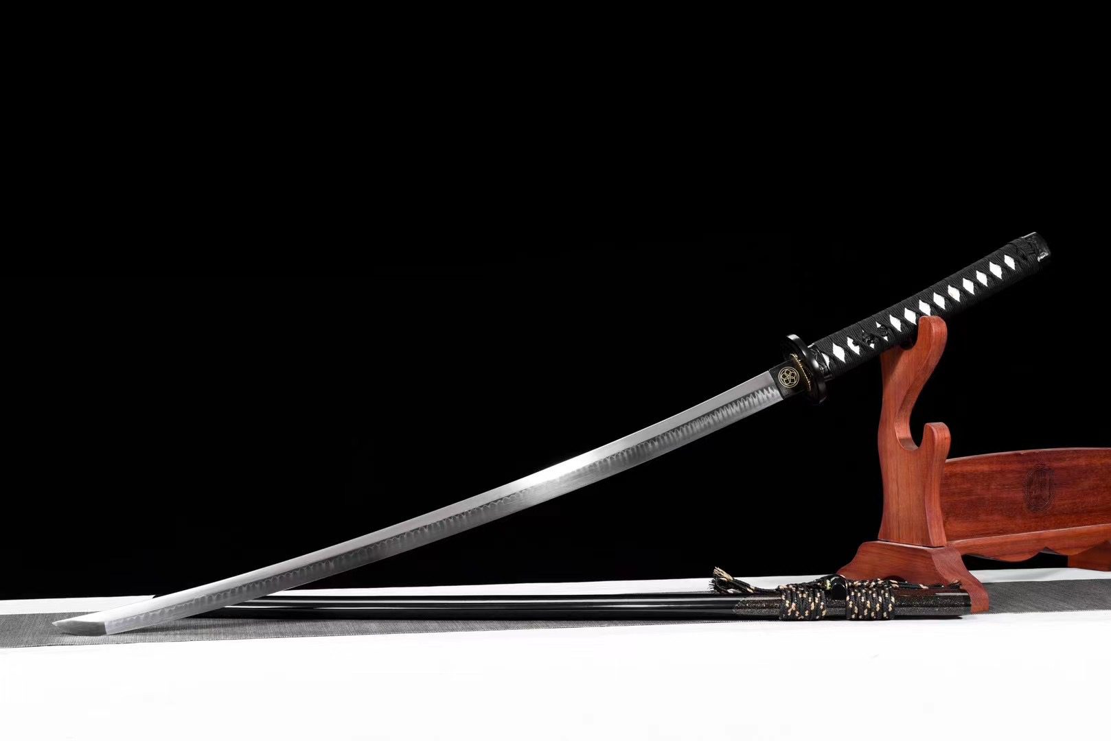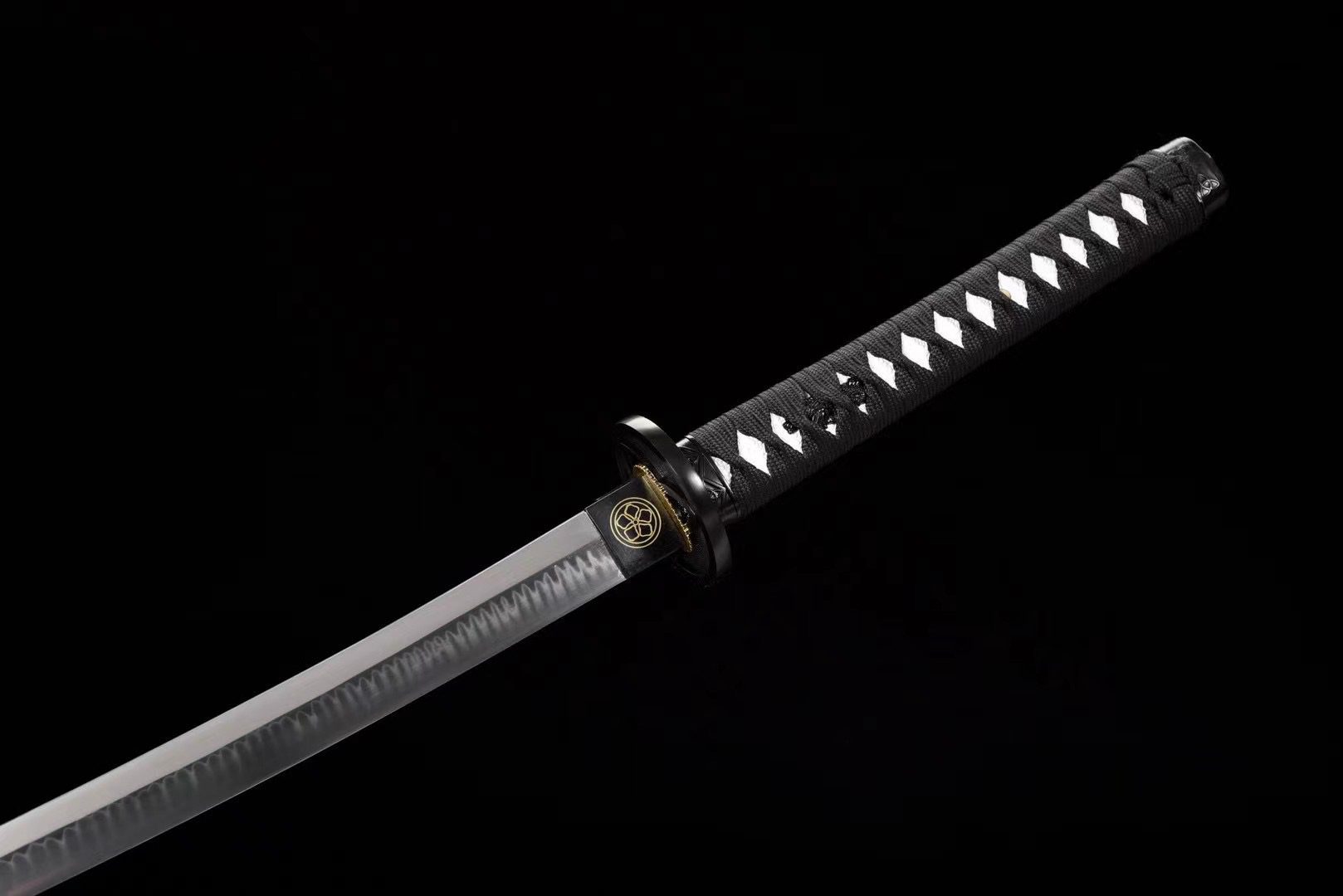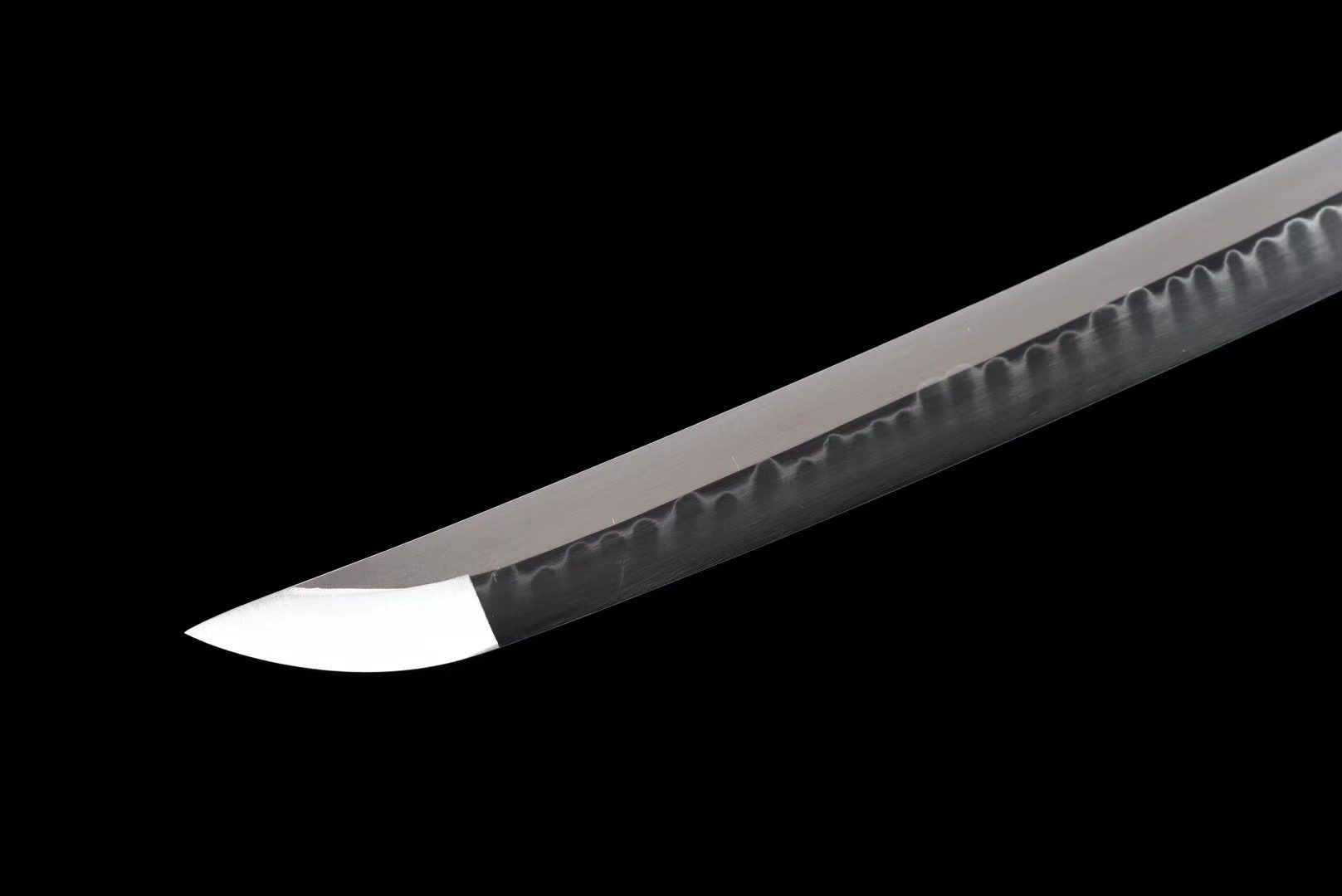 Jego ostrze ze stali T10 ujawnia autentyczny wzór midare zizou hamon, będący wynikiem różnicowego hartowania, które tworzy nieregularne fale wzdłuż krawędzi tnącej. Ponadto okrągła czarna tsuba ze stopu metali zawiera trójnóg życia, święty motyw, który znajduje się również na fuchi i kashira, tworząc niezwykłą harmonię wizualną. Rękojeść łączy białą sztuczną skórę płaszczki z czarnym oplotem tsuka-ito w romby, a menuki przedstawiają czarnego smoka, mitycznego strażnika mądrości. Wreszcie, ziarnista czarna lakierowana drewniana pochwa jest ozdobiona złotym błyszczącym czubkiem, a czarno-złoty sageo dopełnia tę wyrafinowaną estetykę.