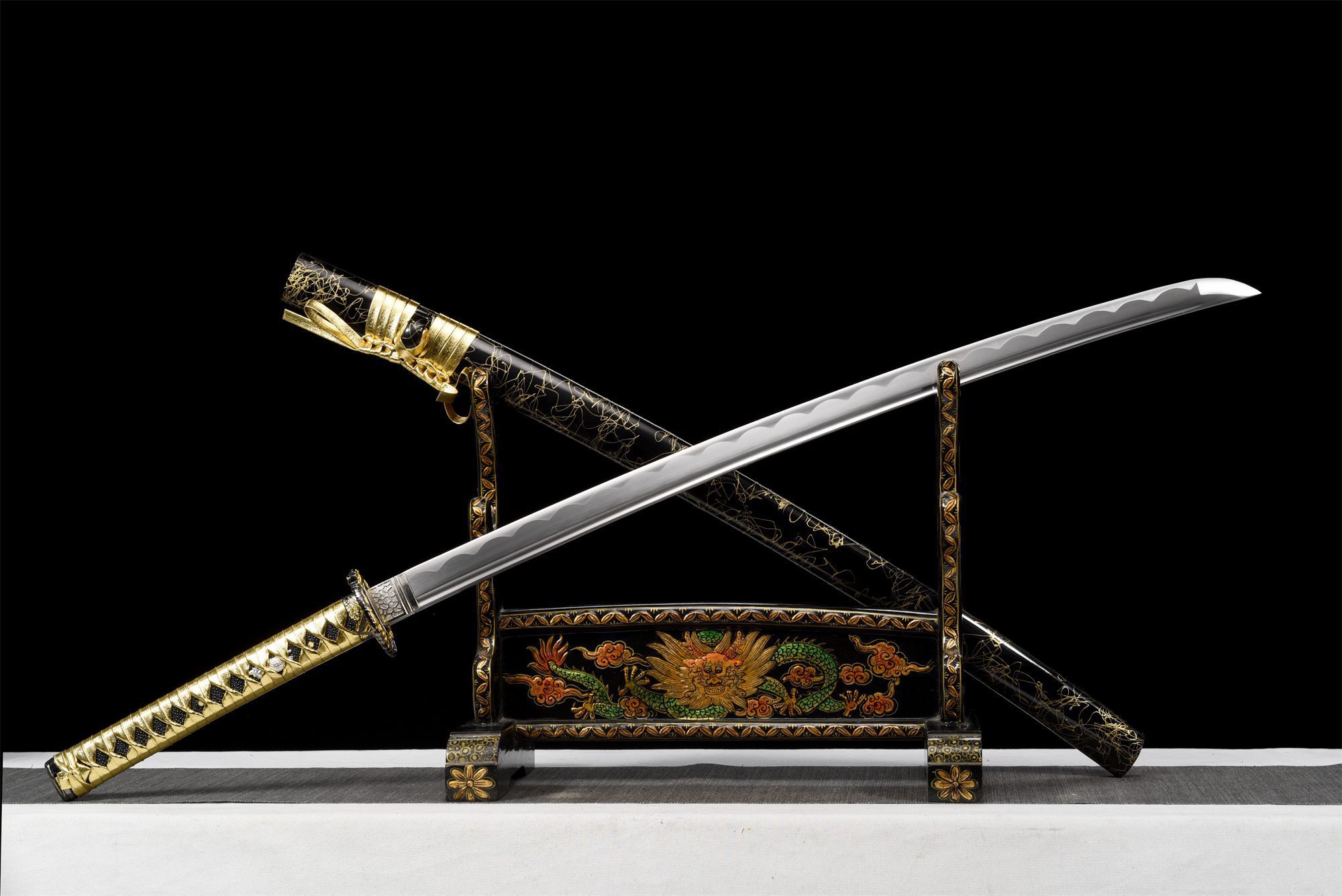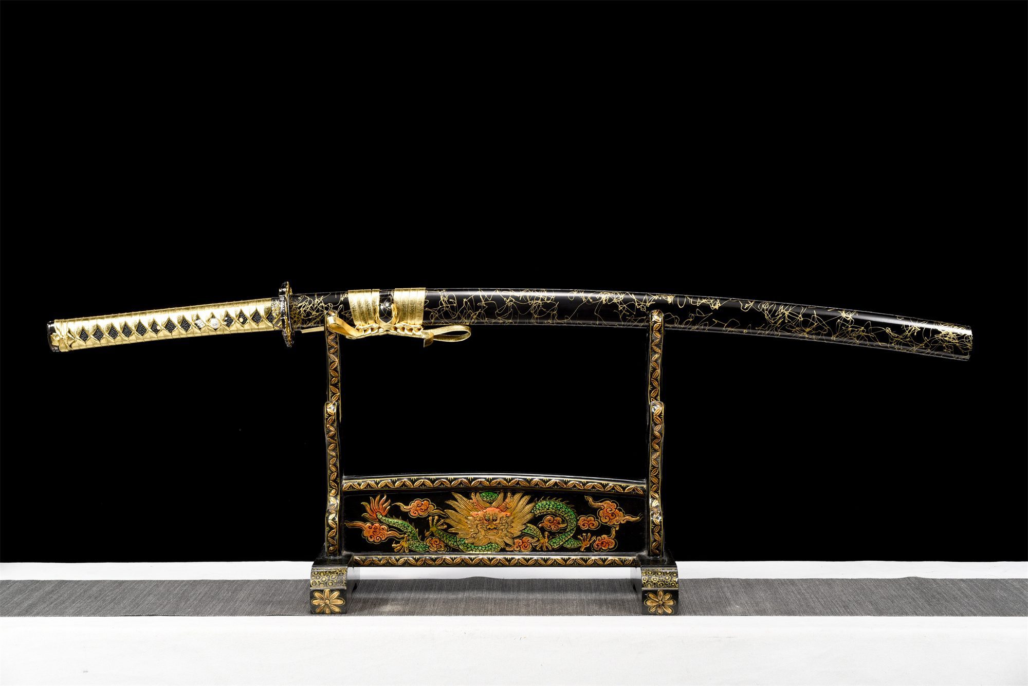 - Pochwą (Saya 鞘): drewno lakierowane na czarno i złoto.