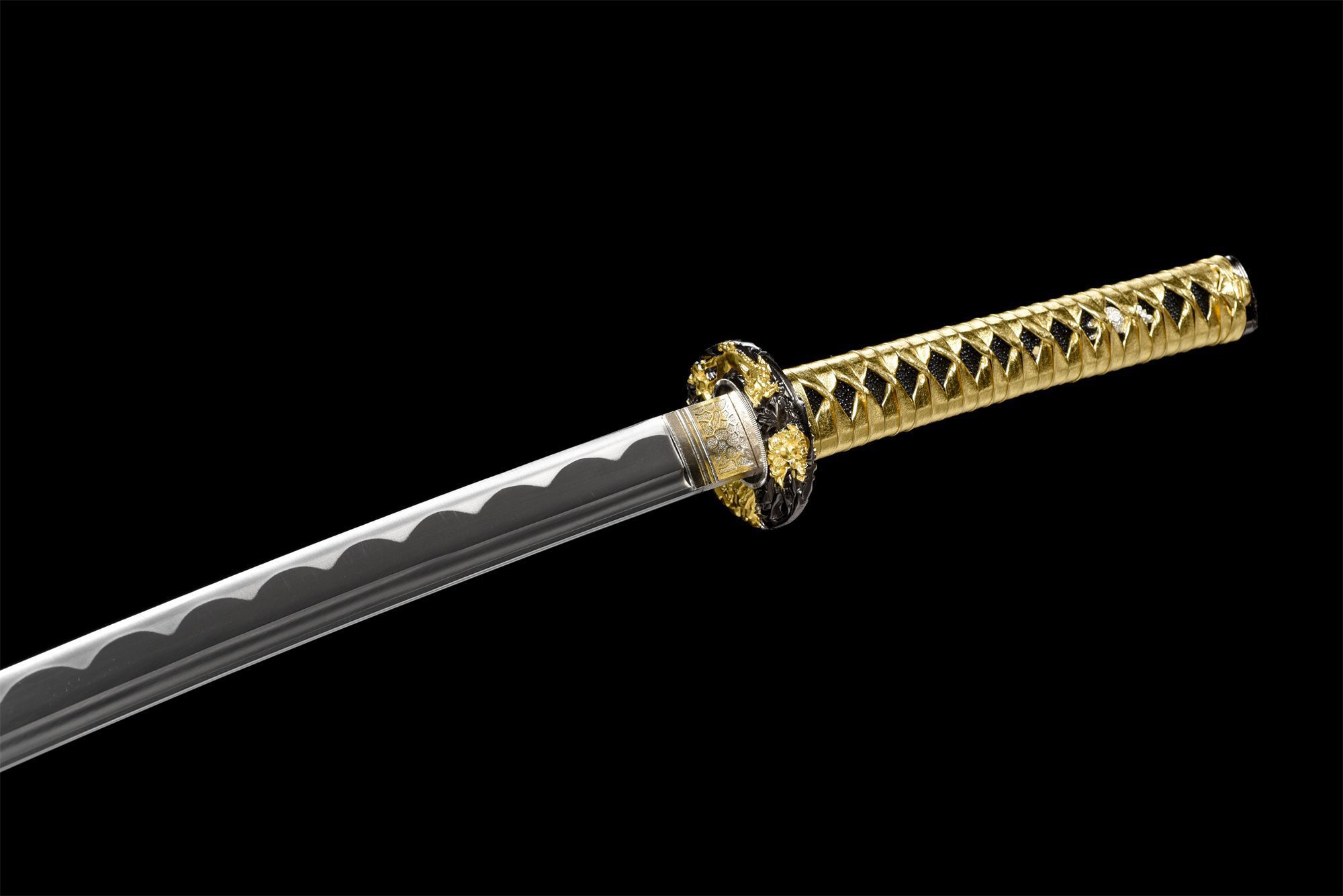 Ostrze ze stali 1060 ma głęboki czarny kolor, który pięknie kontrastuje z prawdziwym hamon notare uzyskanym dzięki różnicowemu hartowaniu. Bo-hi elegancko wydrąża powierzchnię ostrza, łącząc funkcjonalność i estetykę. Zaokrąglona tsuba z czarnego i złotego stopu zdobiona jest delikatnymi motywami kwiatowymi oraz majestatycznym lwem, symbolizującym odwagę i szlachetność. Rękojeść (tsuka) harmonijnie łączy czarną sztuczną skórę płaszczki ze złotym plecionym skórzanym wykończeniem tworzącym regularne romby, a srebrne menuki dodają dodatkowego wyrafinowania. Fuchi i kashira nawiązują do kwiatowych motywów osłony w tym samym czarno-złotym wykończeniu, tworząc idealną spójność wizualną. Czarno-złota lakierowana pochwa idealnie pasuje do całości, a złota sageo podkreśla elegancję tego dzieła.