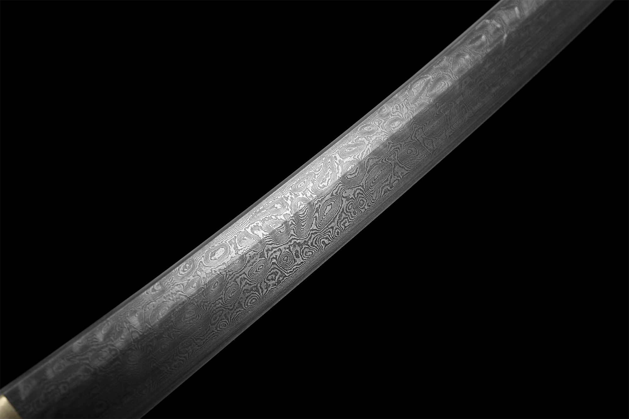 Ostrze z damasceńskiej stali ujawnia faliste wzory, które w naturalny sposób przywodzą na myśl prądy wodne, a naturalne wykończenie stali przechwytuje i odbija światło niczym powierzchnia spokojnego jeziora. Prostokątna, pozłacana miedziana tsuba przedstawia uderzającą scenę: giganta wyłaniającego się z fal, otoczonego stylizowanymi falami, które świadczą o japońskim kunszcie. Rękojeść (tsuka) harmonijnie łączy autentyczną skórę płaszczki z litego drewna, pokrytą zielonym oplotem (tsuka-ito) w rombowy wzór przypominający łuski morskiego smoka. Menuki przedstawiają złote trójzęby, symbole władzy nad żywiołami wodnymi. Czarna lakierowana drewniana pochwa (saya) jest ozdobiona piaskowaną farbą w odcieniach czerni, pomarańczy i błękitu, tworząc gradient przypominający zachód słońca nad oceanem, a prawdziwy róg koiguchi dodaje odrobinę tradycyjnej autentyczności.