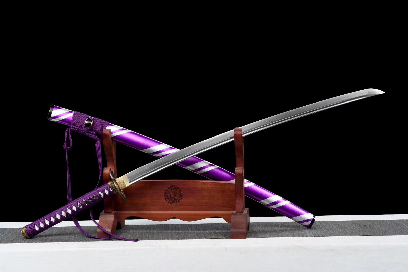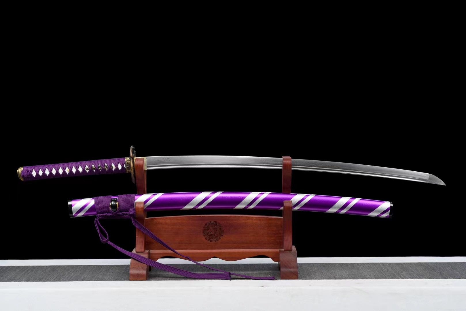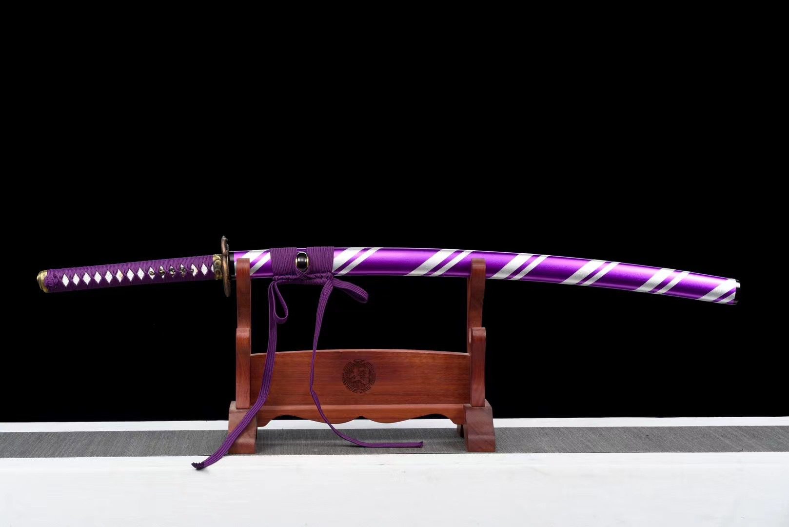 - Pochwą (Saya 鞘): lakierowane drewno z naprzemiennymi białymi i fioletowymi liniami, z czarnym Kojiri i Koiguchi.