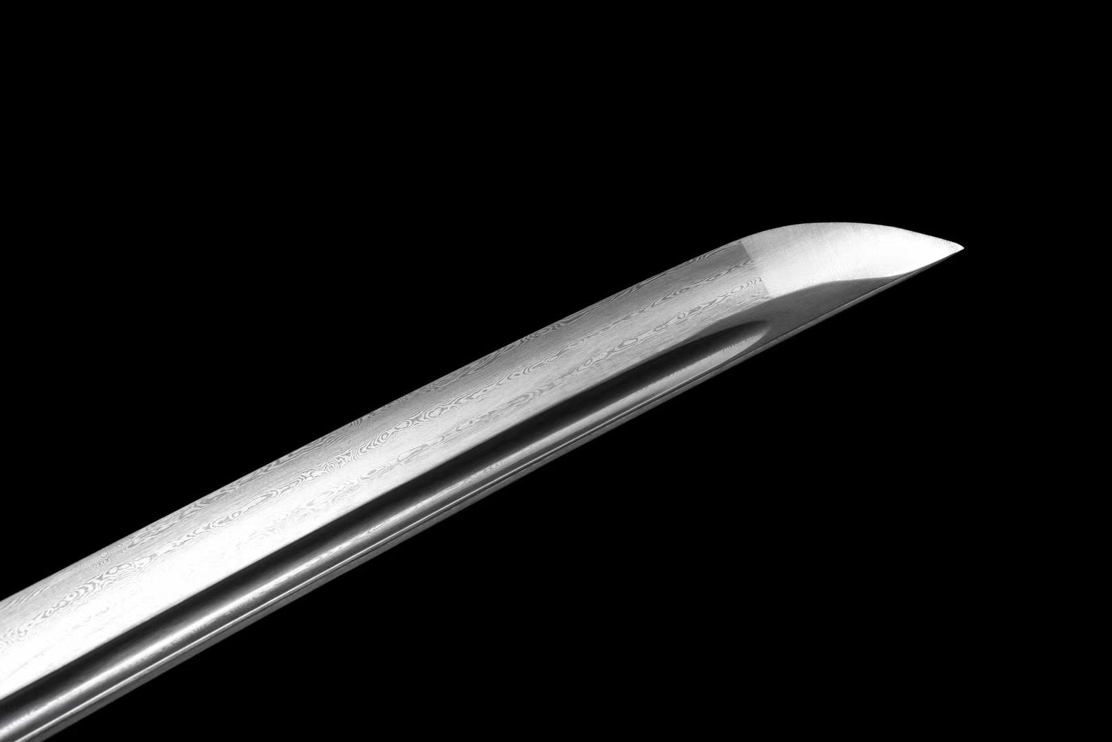 Ostrze ze stali damasceńskiej ma falisty wzór przypominający łuski węża, a bo-hi rozjaśnia ogólny efekt i wydaje charakterystyczny świst, gdy miecz jest poruszany. Miedziana tsuba przedstawia zwiniętego węża, motyw powtarzający się na fuchi i kashira. Rękojeść łączy w sobie szorstką teksturę białej samegawy z fioletowym splotem w kształcie rombów, zapewniając pewny i elegancki uchwyt. Menuki przedstawiają czarnego smoka. Lakierowana pochwa subtelnie przeplata białe i fioletowe linie, kontrastujące z czarnymi końcami, a fioletowe sageo dopełnia całość.