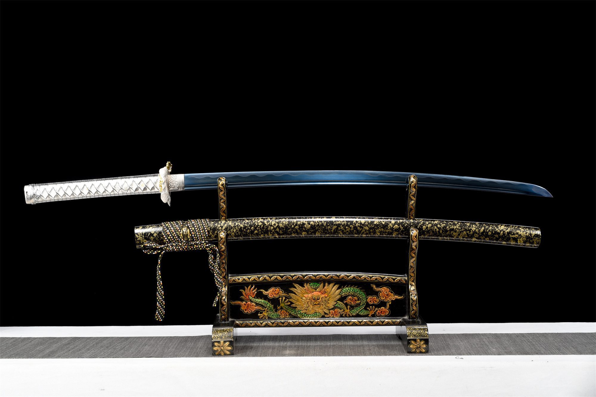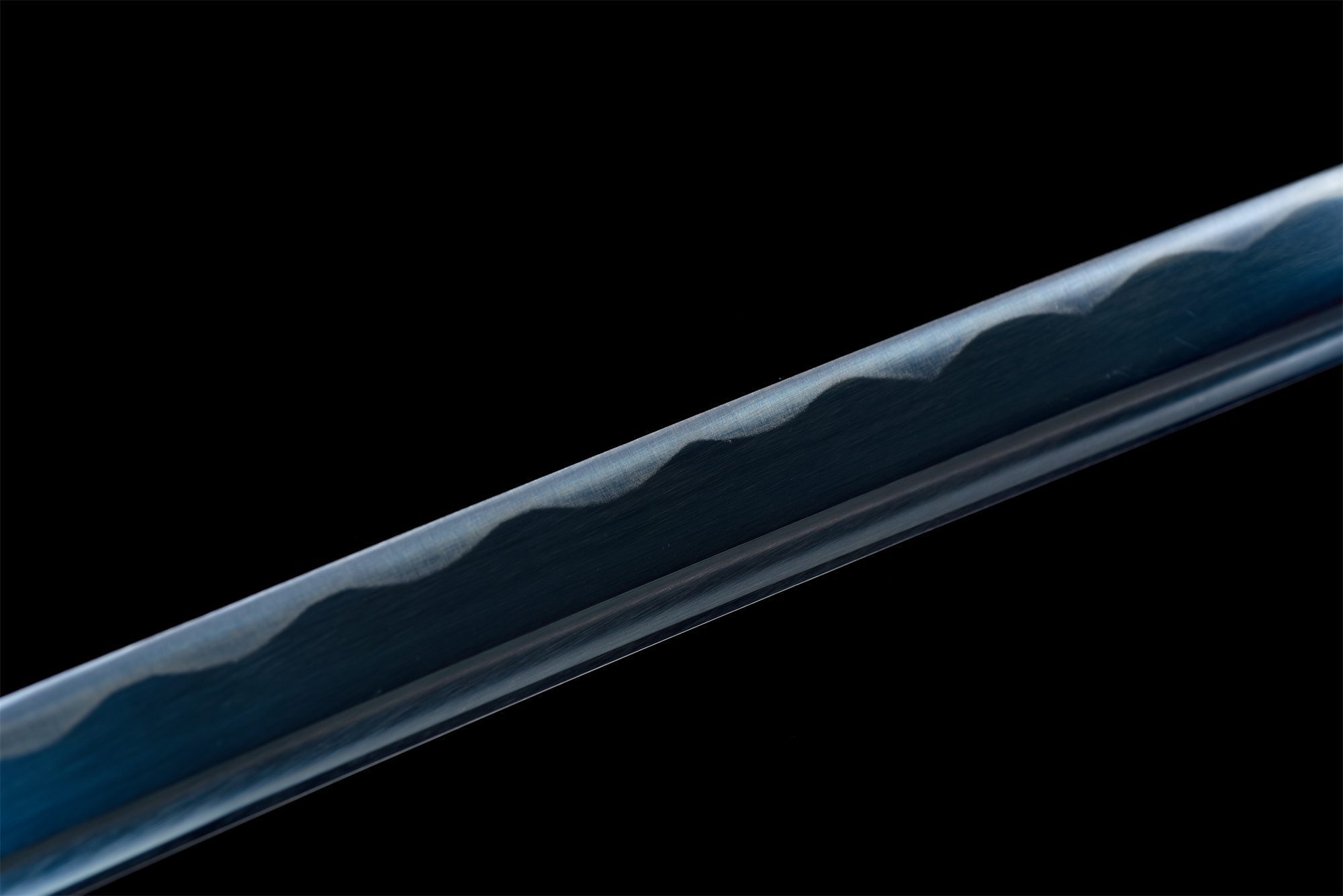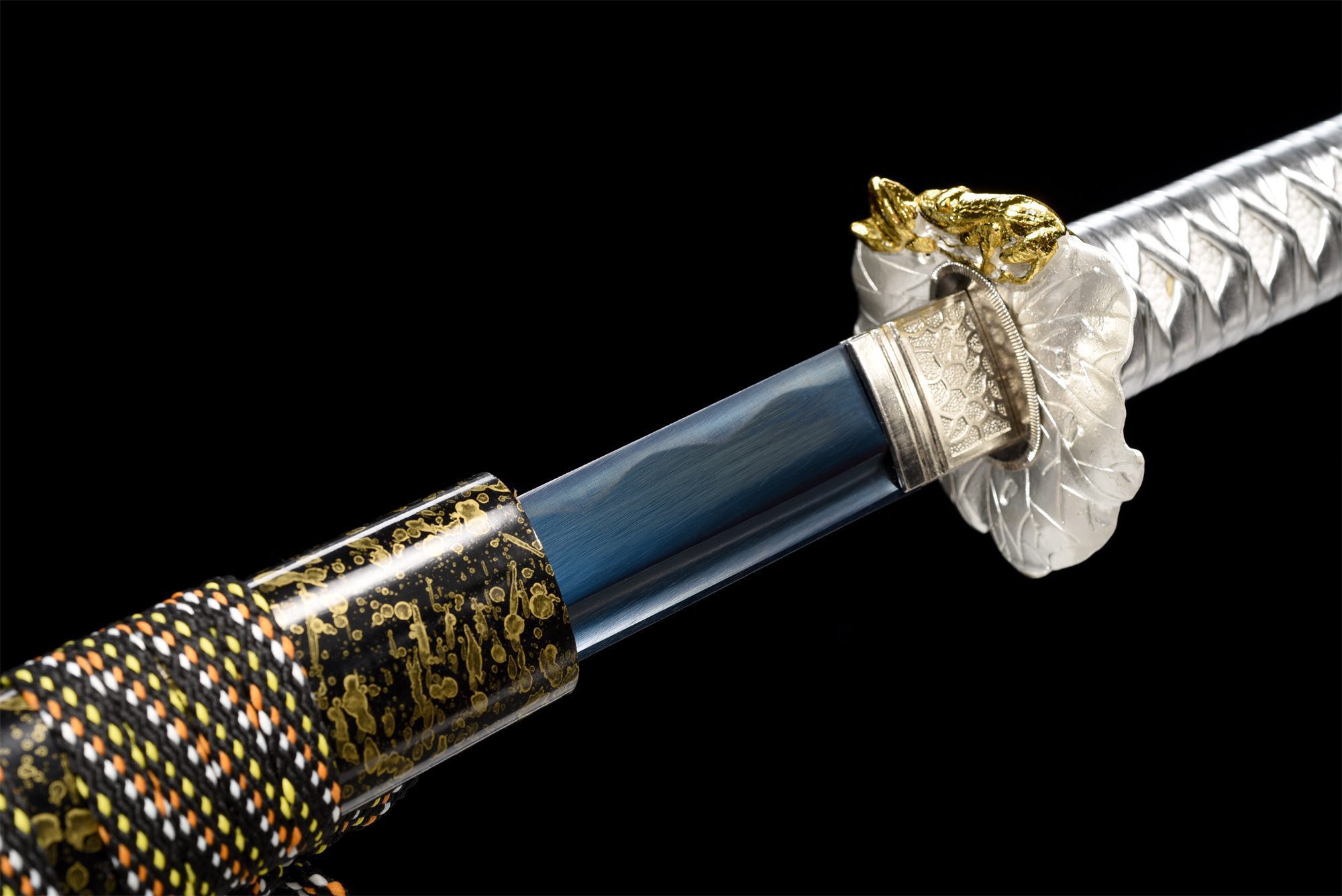 Ostrze ze stali 1060 ma charakterystyczny niebieski odcień, który odbija światło jak powierzchnia spokojnego stawu, a prawdziwy hamon notare tworzy subtelne fale wzdłuż krawędzi tnącej dzięki tradycyjnemu hartowaniu różnicowemu. Bo-hi rozjaśnia ostrze, wydając charakterystyczny świst podczas ruchu. Osłona tsuba ma formę srebrnego liścia ze złotą ropuchą w środku, symbolizującą dobrobyt i przemianę w kulturze japońskiej. Rękojeść tsuka łączy białą skórę płaszczki z srebrnym splotem ze sztucznej skóry w romby, tworząc mocny i elegancki uchwyt. Srebrne ozdoby fuchi i kashira są zdobione złotymi kwiatami przypominającymi kwiaty wiśni, a czarna lakierowana drewniana pochwa saya jest ozdobiona złotymi kroplami wody, które błyszczą jak gwiazdy.