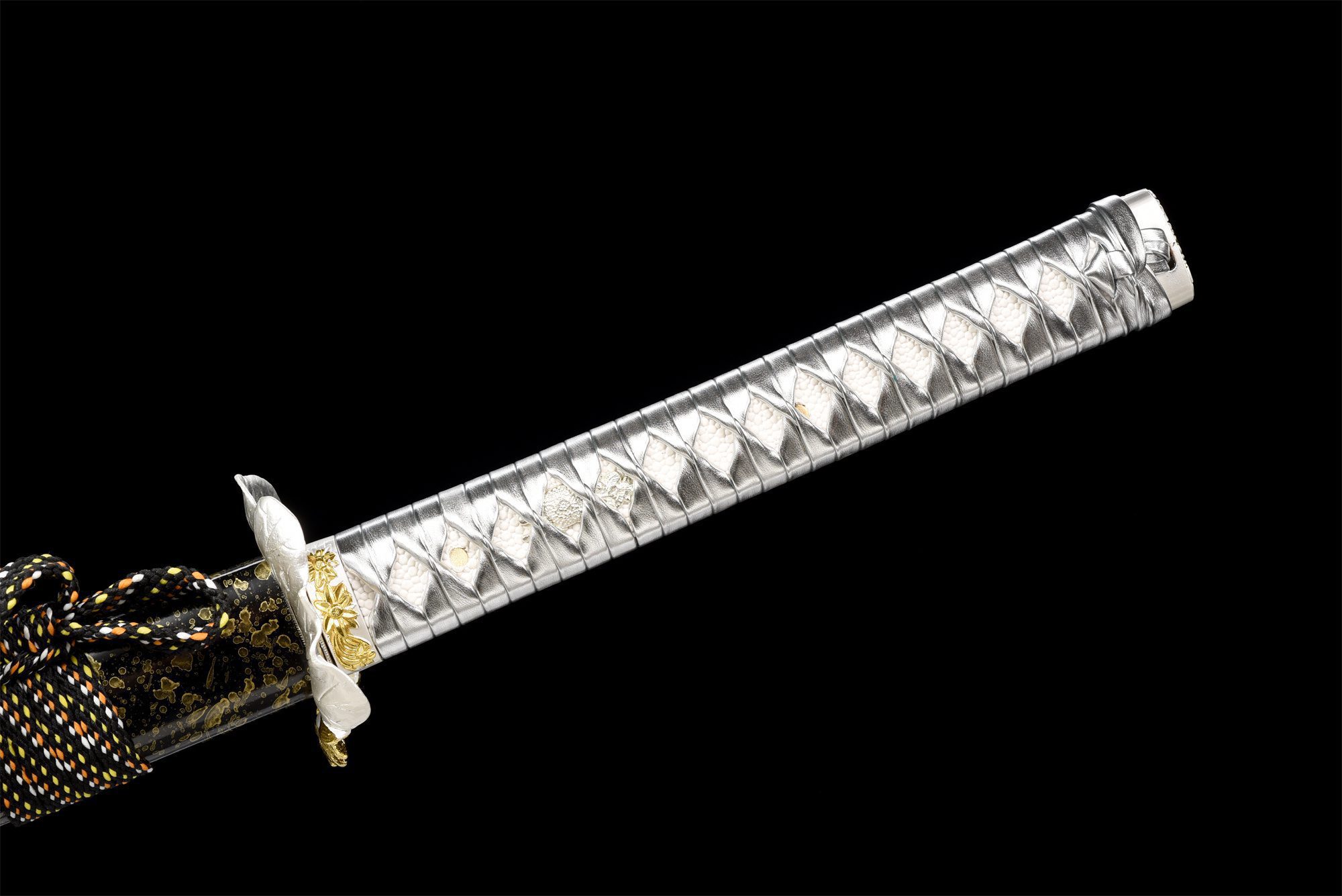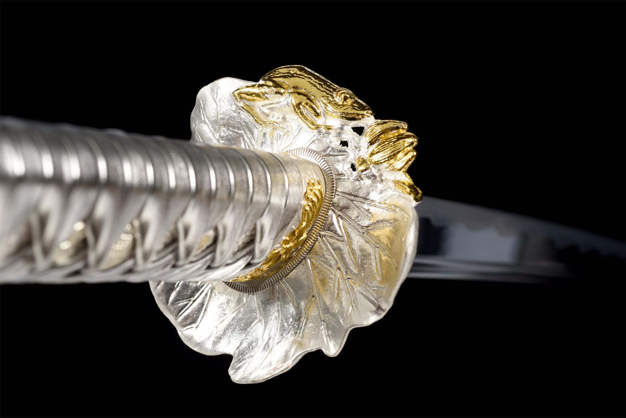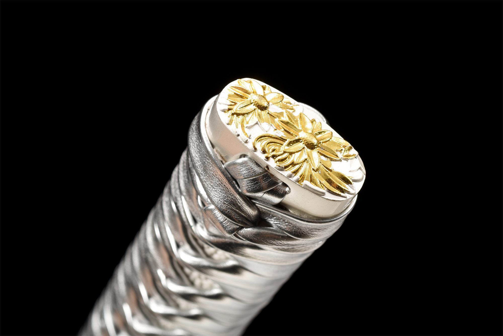 - Kashira (頭): Srebrny stop ozdobiony złotymi kwiatami.