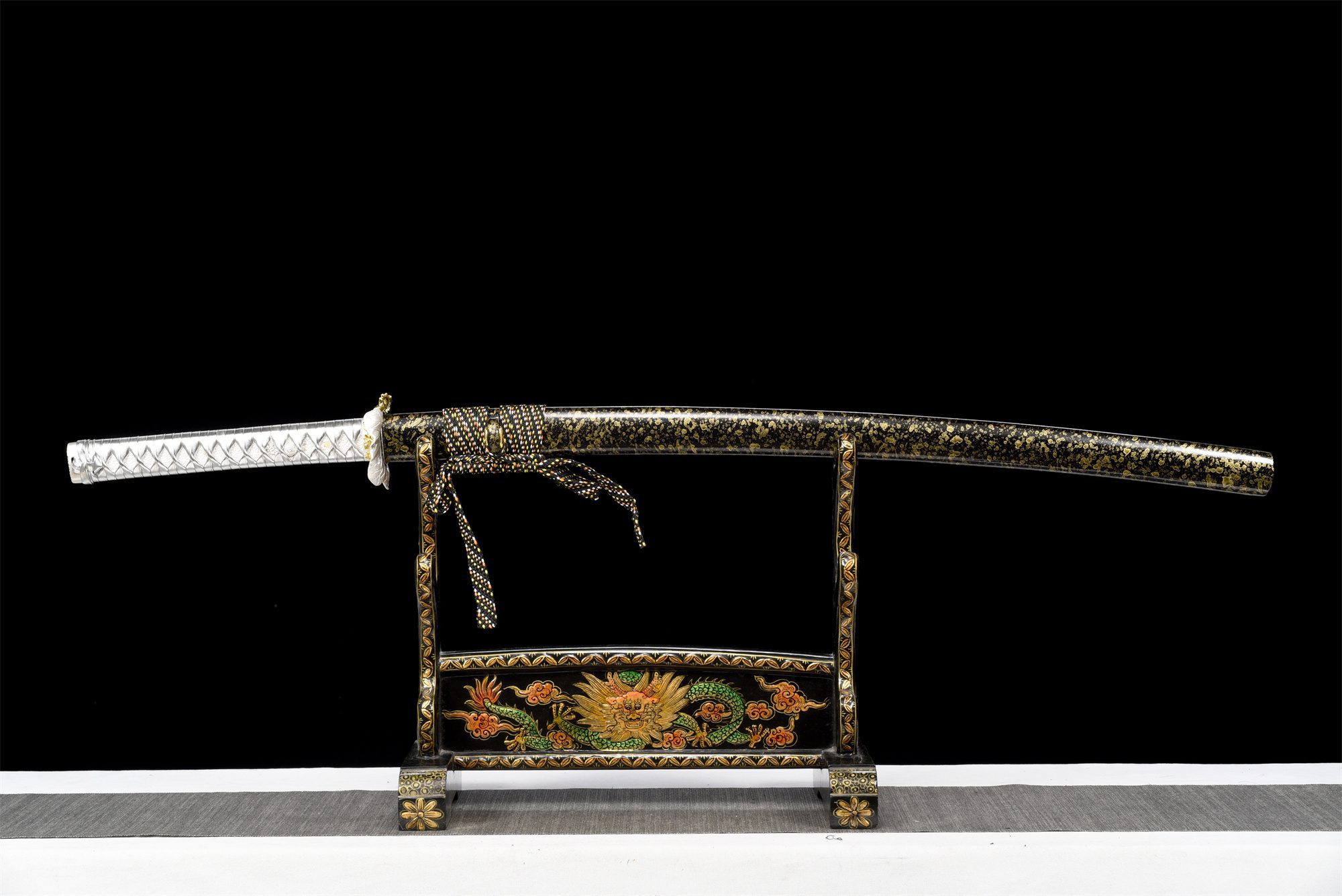 - Pochwą (Saya 鞘): Czarne lakierowane drewno ozdobione złotymi kroplami wody.