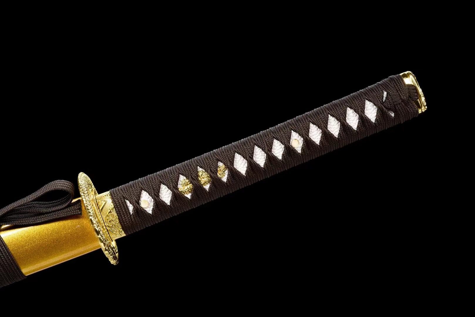 Ostrze ze stali T10 ma stalowe i rdzawe wykończenie, które przywołuje naturalną patynę czasu, a prawdziwe hamon notare, uzyskane dzięki różnicowemu hartowaniu, tworzy nieregularne fale wzdłuż krawędzi tnącej. Bo-hi rozjaśnia strukturę, jednocześnie wytwarzając charakterystyczny świst podczas ruchu. Okrągła złota tsuba przedstawia smoka zwiniętego w idealną okrągłą kompozycję, symbolizującą wieczność i cykl kosmiczny. Rękojeść łączy w sobie białą skórę płaszczki (samegawa) i drewno, owinięte brązowym oplotem (tsuka-ito) w rombowy wzór, który zapewnia pewny i elegancki chwyt. Menuki przedstawiają złote smoki wyłaniające się spod oplotu, a grawerowane fuchi i kashira ze złotej stopu dopełniają harmonię dekoracyjną. Młotkowane mosiężne habaki idealnie pasuje do żółtej, lakierowanej drewnianej pochwy, ozdobionej freskiem smoka, który rozciąga się na całej jej długości. Brązowe sageo splata połączenie między użytkownikiem a jego bronią.