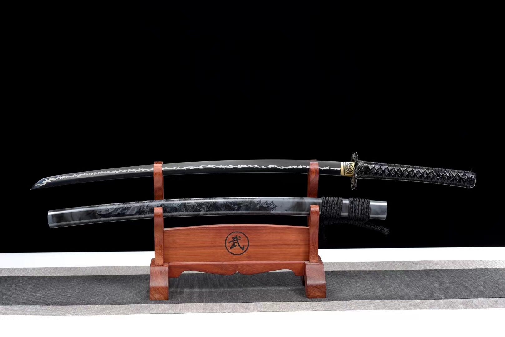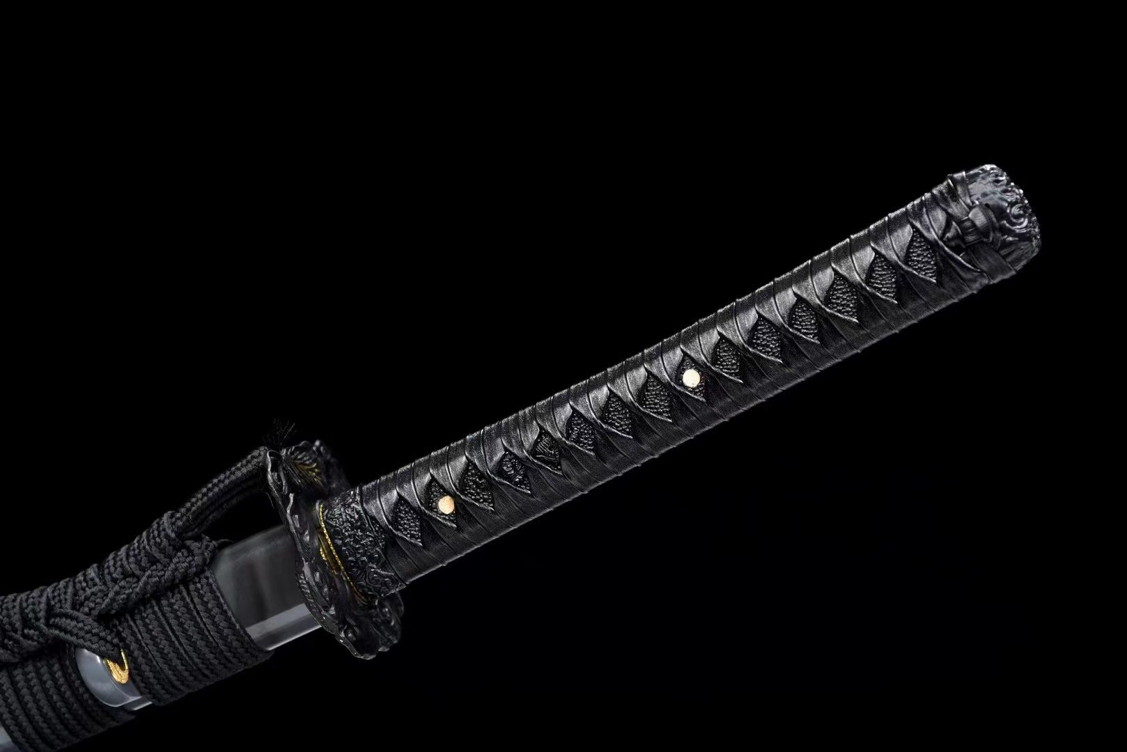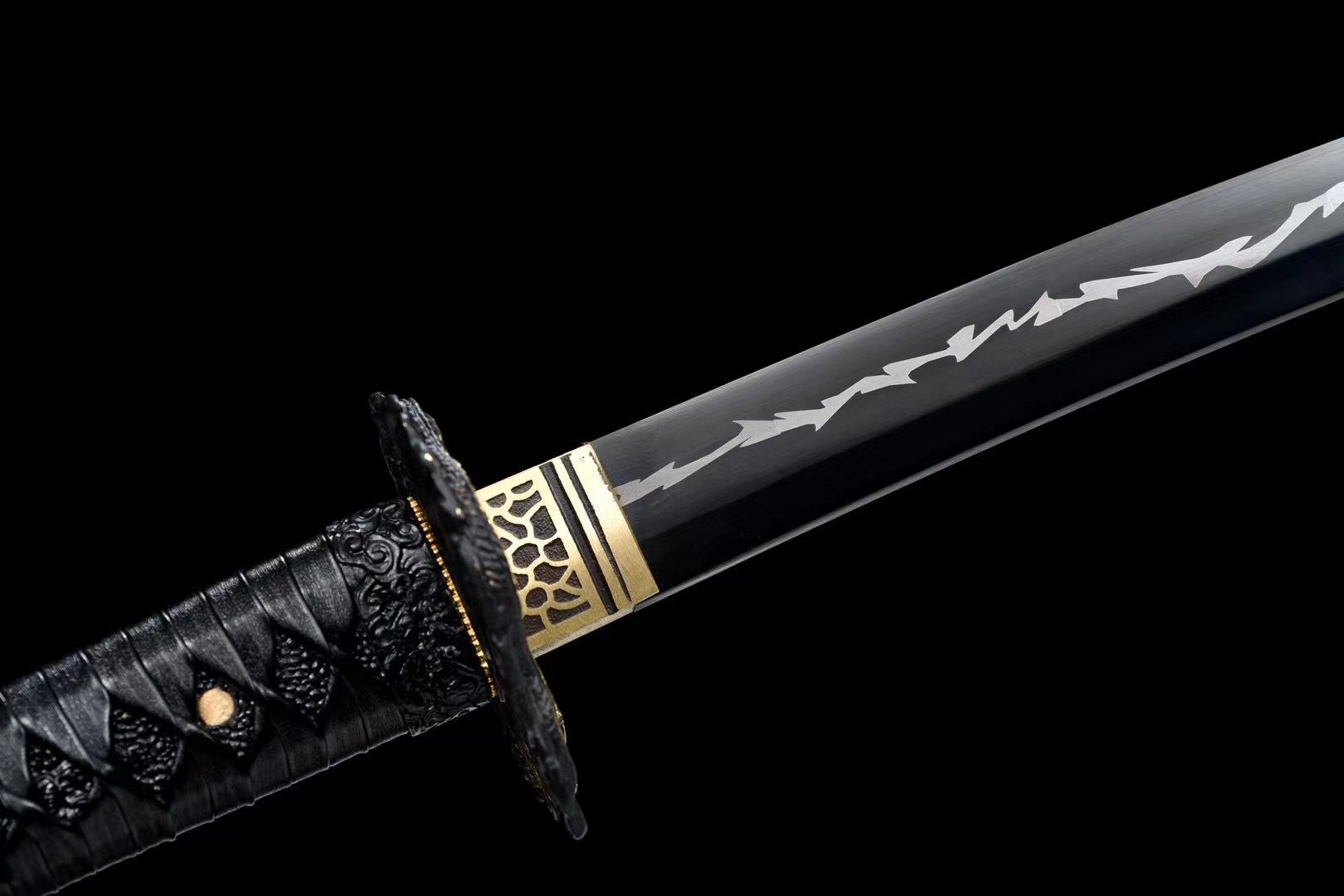 Jej czarne ostrze ze stali T10 ma ciemne wykończenie przypominające burzowe chmury poprzedzające błyskawice. Ten głęboki odcień pięknie kontrastuje ze złotym mosiężnym habaki ozdobionym czarnymi wzorami, tworząc efektowny efekt wizualny. Okrągła czarna tsuba ze stopu metali zawiera precyzyjnie wyrzeźbionego złotego smoka owiniętego wokół gardy, symbolizującego boską ochronę. Rękojeść harmonijnie łączy czarną skórę płaszczki (samegawa) i drewno, a czarne tsuka-ito tworzy plecionkę w kształcie rombu, która zapewnia pewny i elegancki uchwyt. Menuki przedstawiają czarne smoki, które dyskretnie wtapiają się w całość, a rzeźbione fuchi-kashira z czarnego stopu dopełniają tę wyrafinowaną estetykę. Szaro-czarna lakierowana drewniana pochwa zdobiona jest freskiem przedstawiającym smoka, który sprawia, że saya staje się prawdziwym dziełem sztuki, a czarne sageo stanowi wykończenie tej monochromatycznej kompozycji wzbogaconej złotem.
