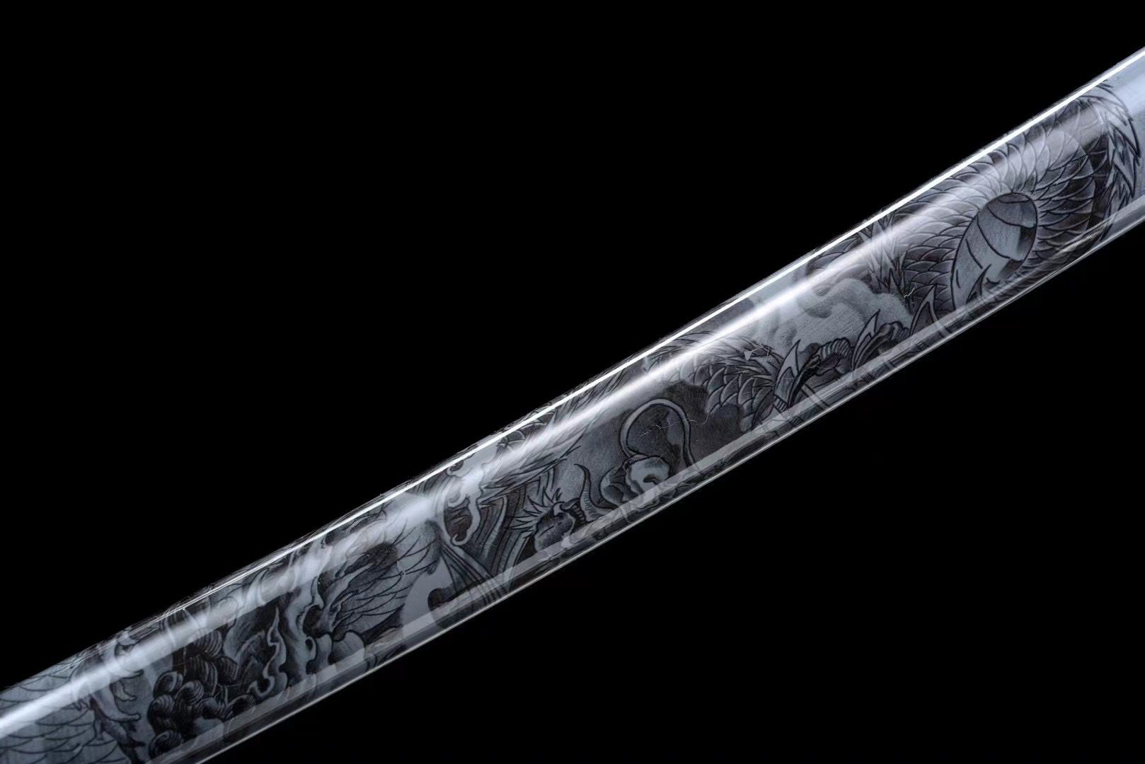 - Pochwą (Saya 鞘): szaro-czarna lakierowana drewniana pochwa z freskiem przedstawiającym smoka.