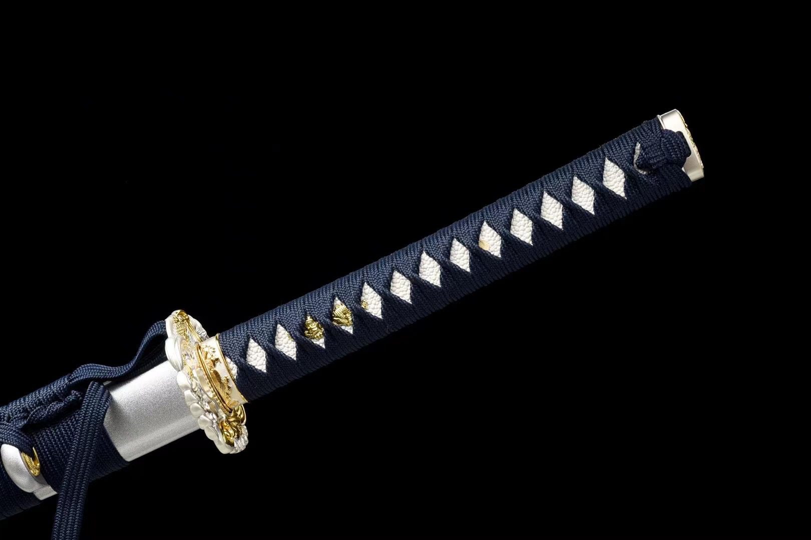 Ostrze ze stali T10 ma głęboki niebieski odcień przypominający odbicia strumienia w porannym świetle. Ta wyjątkowa kolorystyka idealnie komponuje się z okrągłą tsubą ze stopu srebra i złota, ozdobioną symbolami ryb pływających w wiecznym wodnym balecie. Rękojeść łączy w sobie szorstką fakturę białej sztucznej skóry płaszczki z ciepłem drewna, a niebieskie plecionki w romby tworzą wyrafinowany efekt geometryczny. Menuki przedstawiają złotego smoka, mitycznego strażnika niebiańskich wód, a habaki z szczotkowanego mosiądzu zdobi tradycyjny kamon. Ziarniasta, biała, lakierowana drewniana pochwa zdobiona jest delikatnym freskiem przedstawiającym złote rybki, tworząc uderzający kontrast z niebieskim sageo, które dopełnia tę chromatyczną symfonię.
