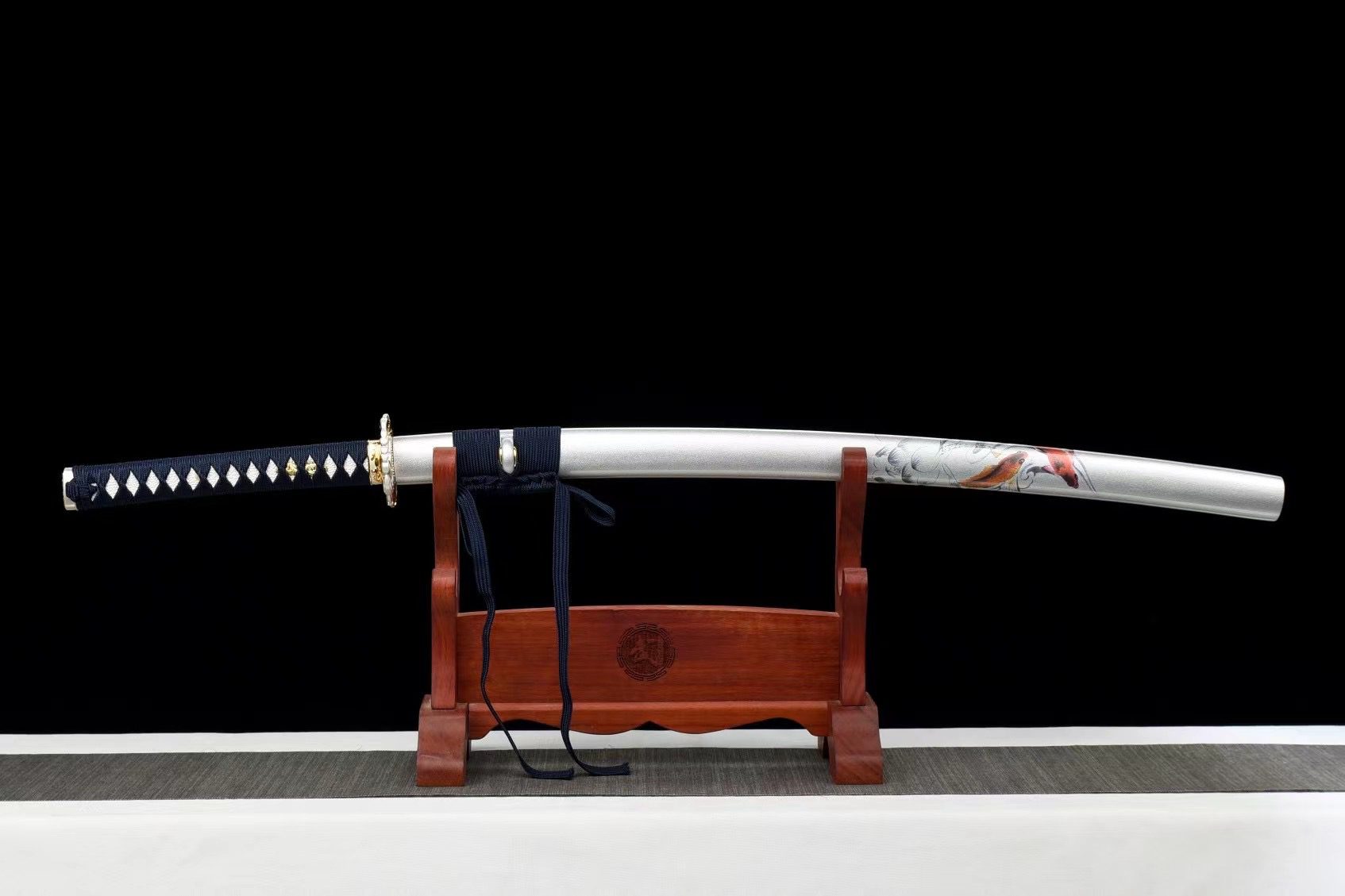- Pochwą (Saya 鞘): wykonana z ziarnistego białego lakierowanego drewna z freskiem przedstawiającym złote rybki.