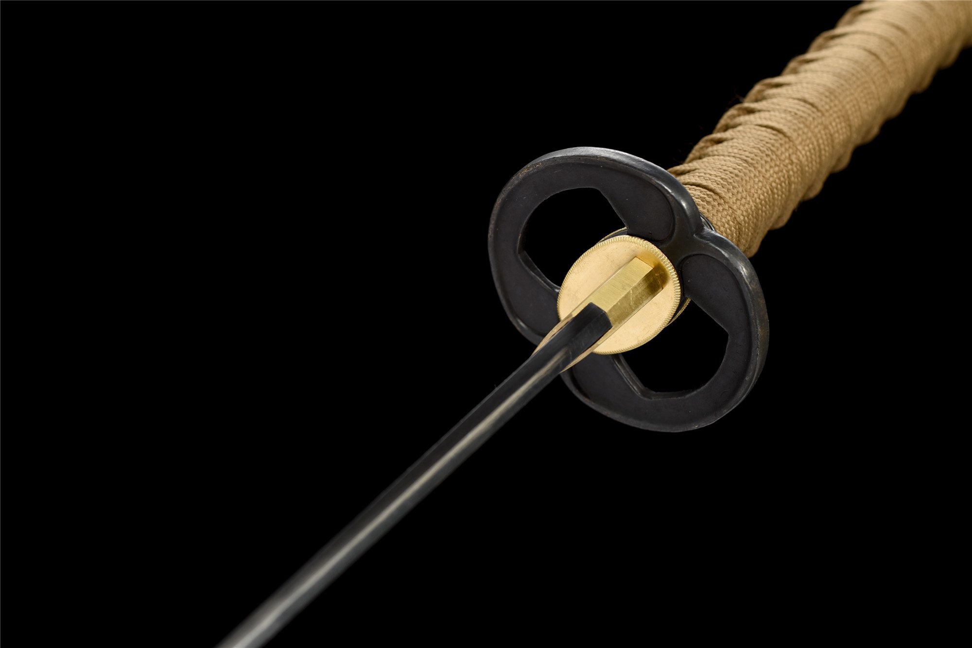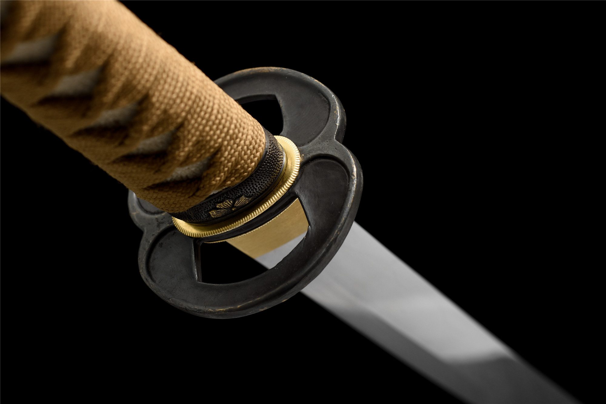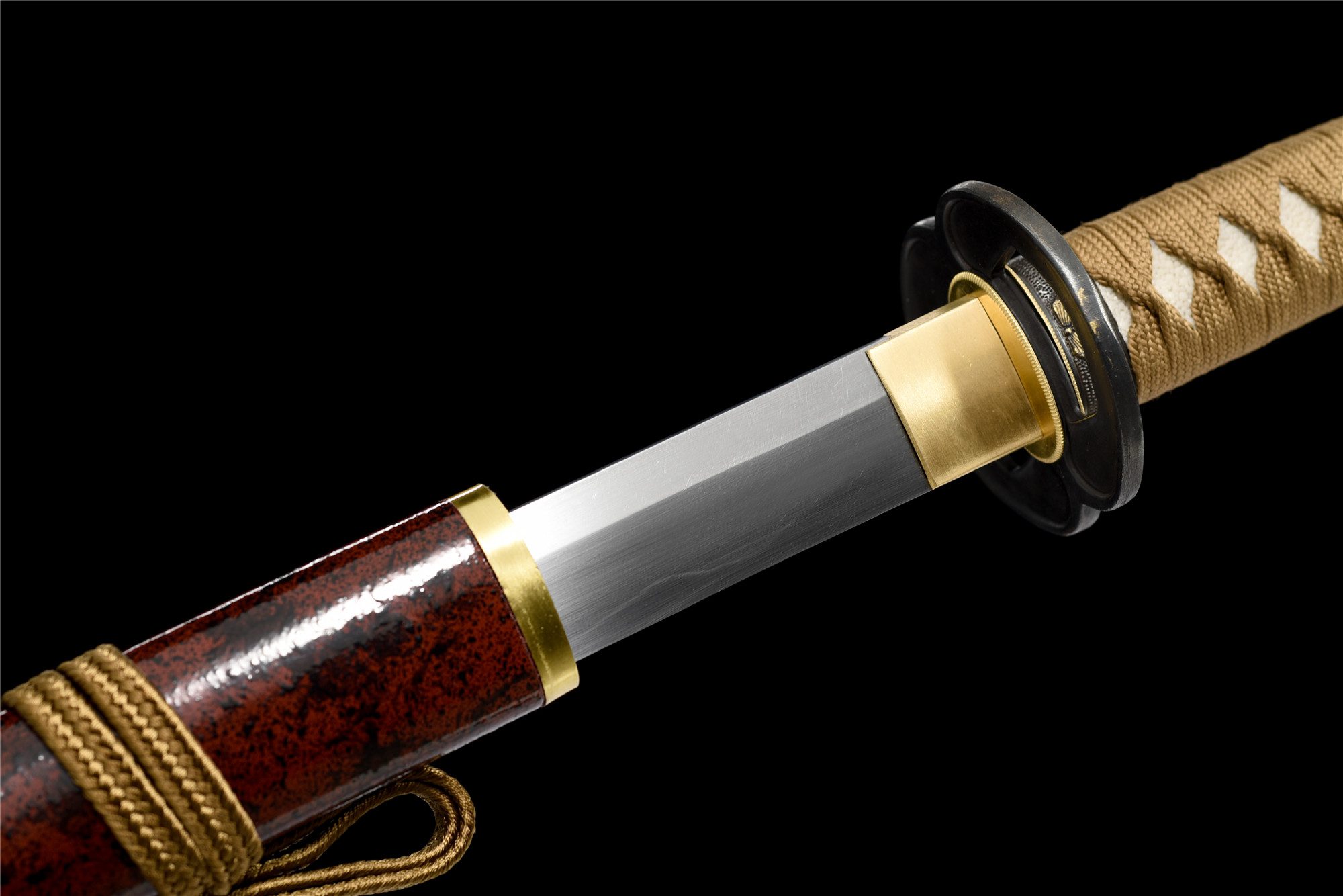 - Tsuka-ITO (柄糸): Pozłacane brązowe plecionki powyżej rękojeści.