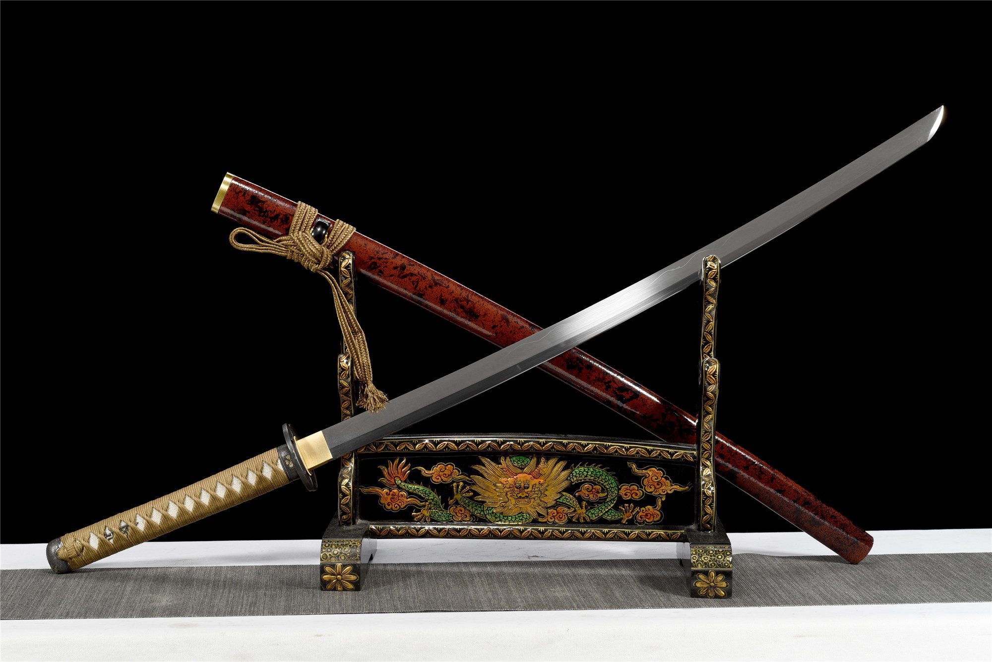 Ostrze ze stali T10 ujawnia autentyczny notare hamon uzyskany dzięki różnicowemu hartowaniu, tworząc naturalne falowania, które wiją się wzdłuż krawędzi jak nocne fale. Okrągła czarna tsuba ze stopu metali charakteryzuje się wydrążonym kształtem motyla, łącząc lekkość i wytrzymałość, jednocześnie przywołując duchową transformację. Rękojeść łączy w sobie prawdziwą skórę płaszczki i twarde drewno, owinięte pozłacanym brązowym tsuka-ito, które harmonijnie kontrastuje ze srebrnymi menuki. Czarne i złote fuchi i kashira stanowią ramę dla tej wyrafinowanej kompozycji, a czarna i fioletowa marmurkowa drewniana pochwa jest wykończona złotymi końcówkami, które elegancko odbijają światło.