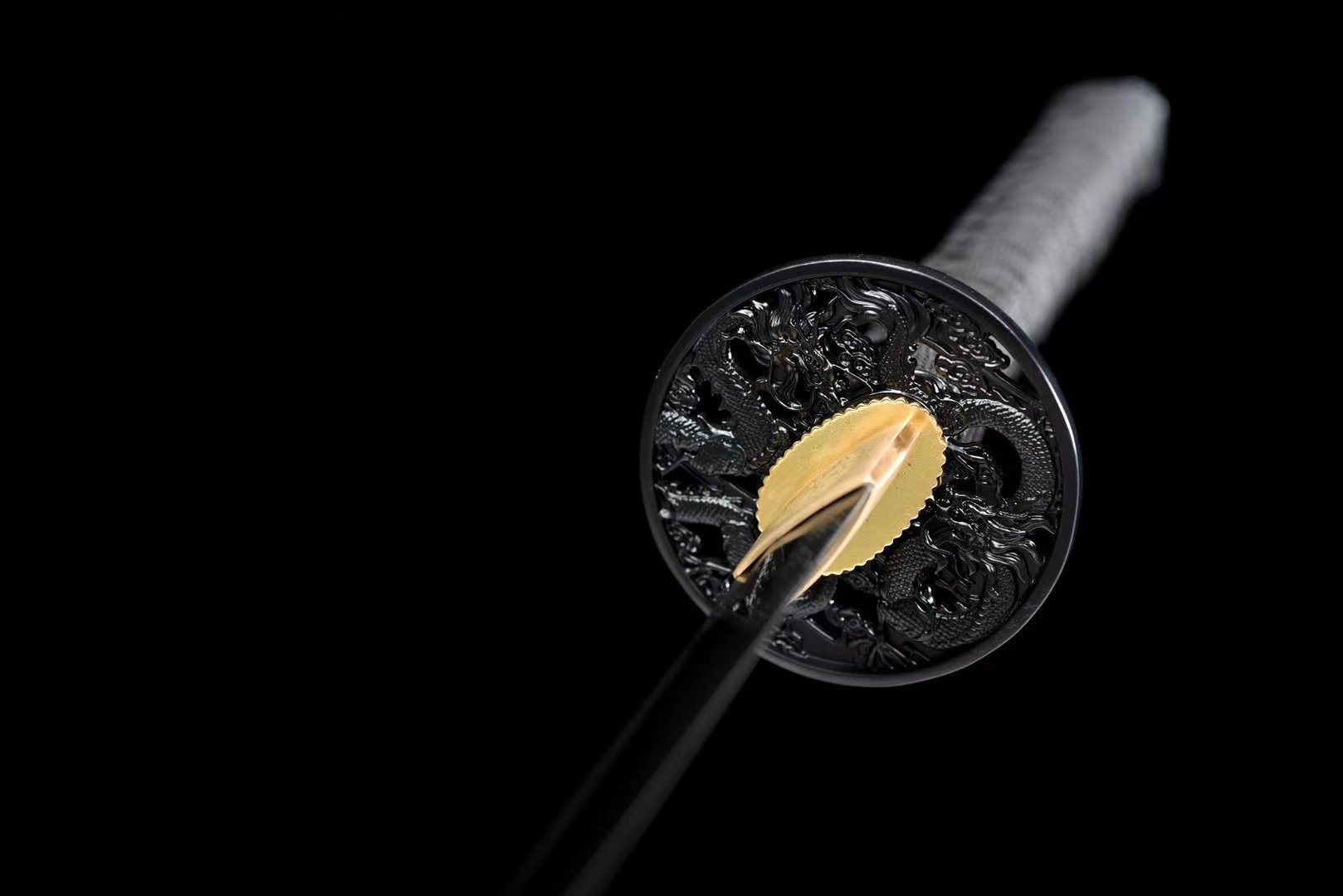 - Jelec (Tsuba 鍔): czarna, okrągła, wykonana ze stopu metali, z wyrzeźbionym smokiem.