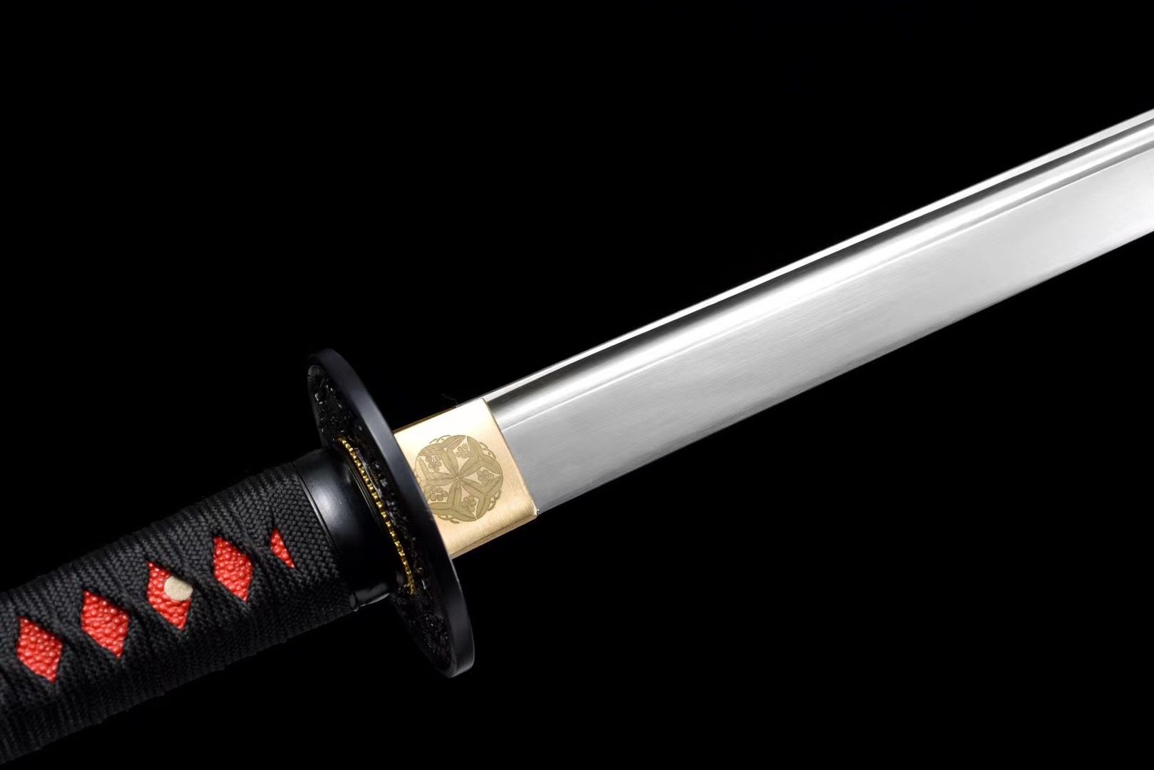 Ostrze ze stali węglowej posiada precyzyjnie wykonane grawerowanie bo-hi, które zmniejsza wagę broni, a jednocześnie wydaje charakterystyczny świst podczas szybkich ruchów. Okrągła czarna tsuba ze stopu metalu posiada precyzyjnie wyrzeźbionego smoka, tworząc grę światła i cienia, która podkreśla mistyczny charakter broni. Rękojeść harmonijnie łączy czerwoną skórę płaszczki i drewno, zapewniając pewny i wygodny uchwyt. Czarne plecionki tsuka-ito w romby elegancko kontrastują z czerwoną podstawą, a menuki przedstawiają czarne smoki, które wydają się wyłaniać z głębi rękojeści. Szkarłatna, lakierowana pochwa jest ozdobiona ręcznie malowanym czarnym smokiem, tworząc efektowny zestaw wizualny, uzupełniony czarnym sageo.