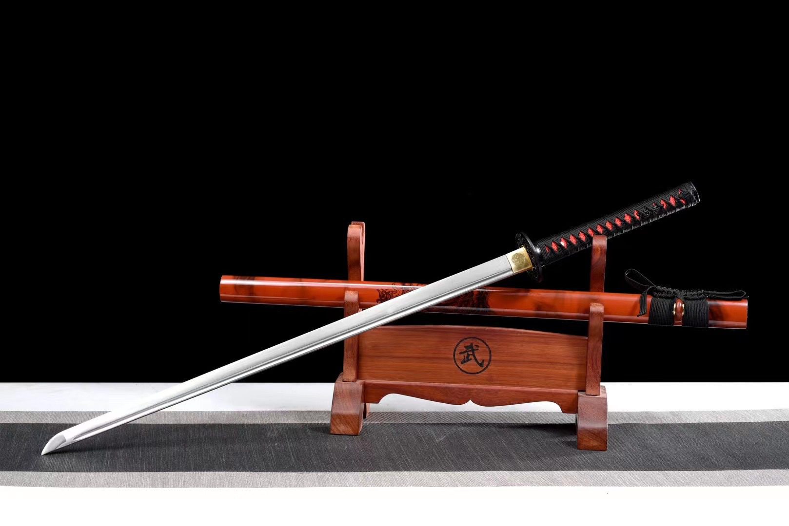 - Pochwą (Saya 鞘): czerwona, lakierowana drewniana pochwa z namalowanym czarnym smokiem.