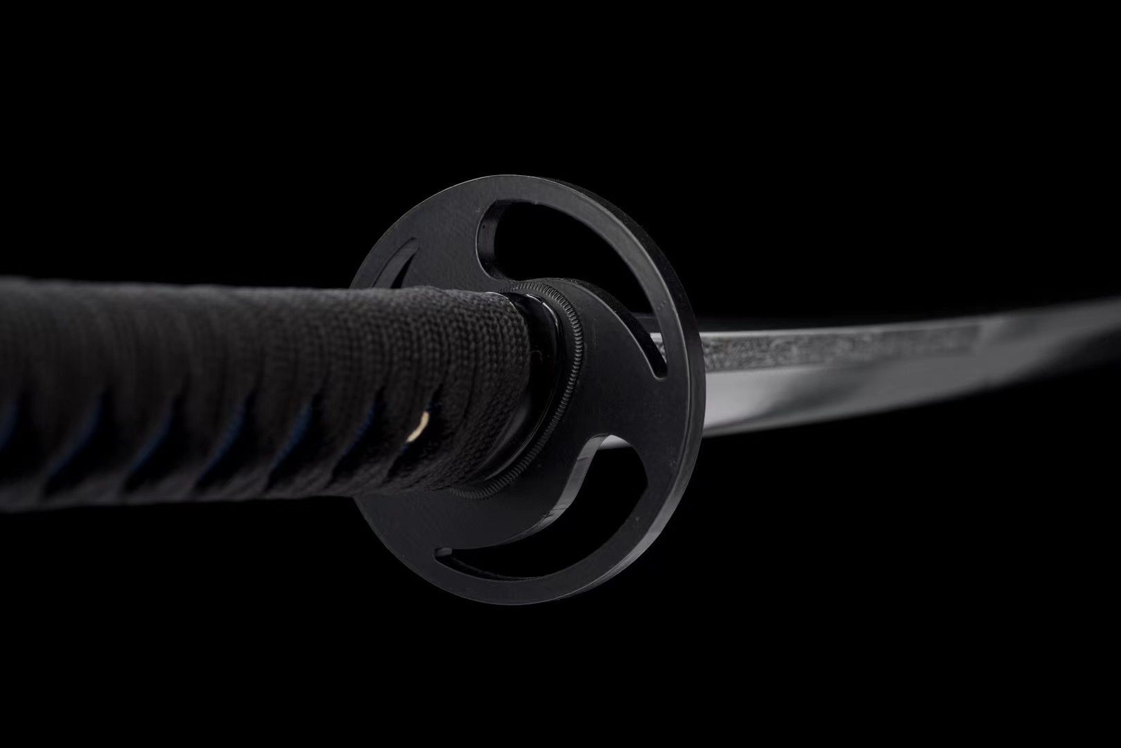 - Jelec (Tsuba 鍔): okrągła garda z czarnego stopu, wydrążona w kształcie shurikenu.